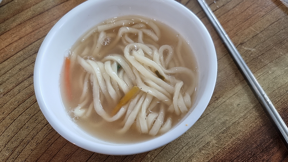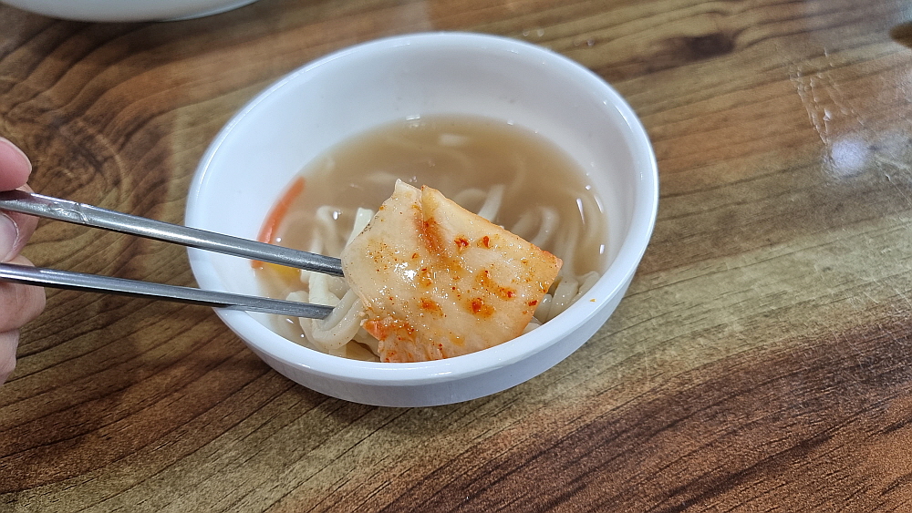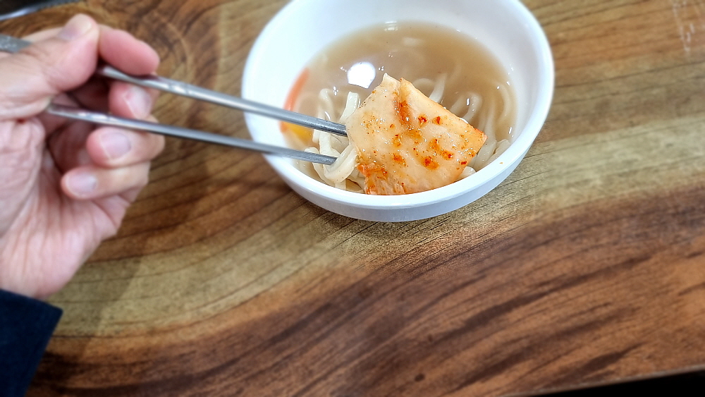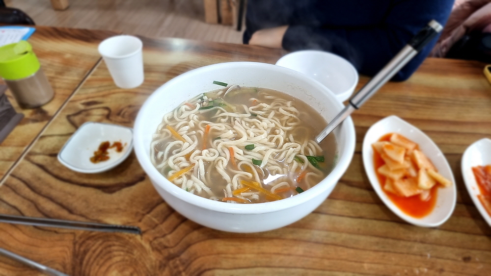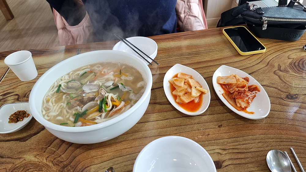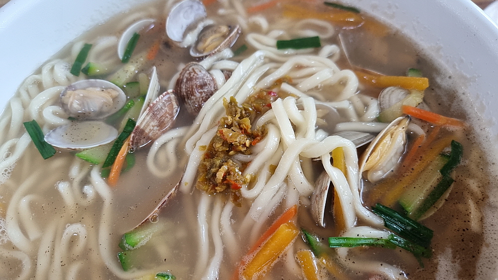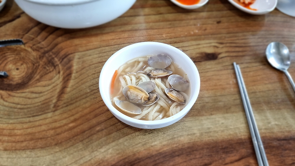 깍뚜기가 아니라 석박지처럼 생긴 무김치와 다소 심심한 듯 시원한 배추김치가 밑반찬으로 포진하는데 셀프로 손님이 리필하는 방식이다. 그런데 이 김치들이 너무 맛이 좋아 우린 세번이나 갖다 먹었다. 보기엔 다소 심심한 듯 한 김치에 내공이 있었다. 바지락 칼국수의 비주얼은 우리가 익히 보아온 맛나 보이는 모양이었다. 별 다른 추가 재료없이 바지락과 약간의 야채가 전부인 국물로 승부를 거는 그런 칼국수였다. 바로 이런 비주얼을 원했던 것이라 얼마나 반가웠는지 모른다. 바지락 칼국수로 제대로 맛을 내기 어려운 이유는 바로 이런 단촐함에 있지 않을까 싶다. 마치 평양냉면이 단순하지만 맛을 내기 어려운 것처럼 말이다.