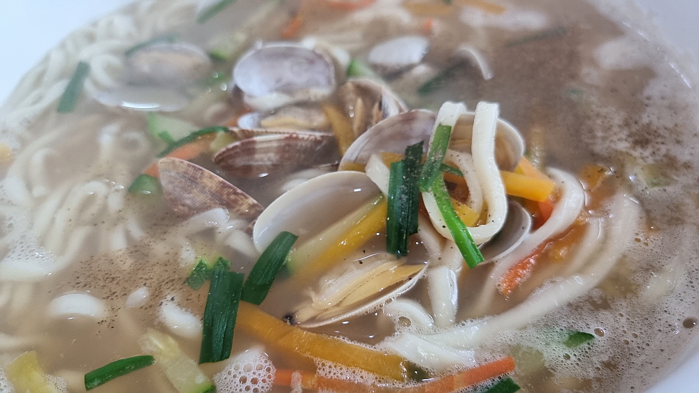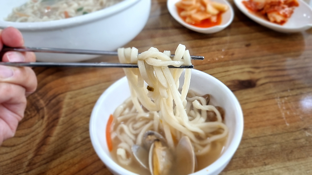 다만 한 가지 아쉬운 것은 바지락의 고장이라는 서해에서 바지락의 양이 그닥 많아 보이지 않았다는 것이다. 물론 많지 않은 양으로도 바지락 국물은 정말 잘 우려냈다. 그리고 바지락도 우리가 평소 먹었던 것보다 더 크고 실하다고 해야할까? 뭔가 고급진 느낌이었다. 아마도 바지락 자체는 값이 좀 나가는 고급품질의 것을 사용하는가 보다. 그래서 양이 많지 않은데도 맛이 나는 모양이다. 면도 보통 색이 들어가는 다른 집들과 달리 여기는 단순 그 자체의 밀가루 천연색의 면이었다. 면발이 나쁘지 않았지만 탄력은 좀 덜한 그런 식감이었다.