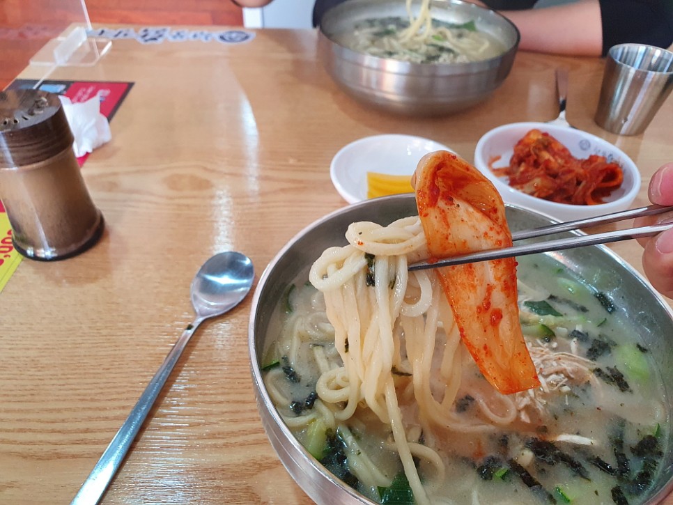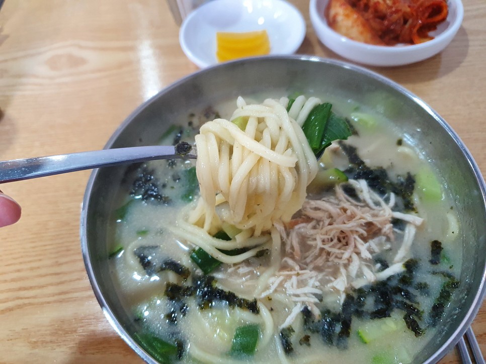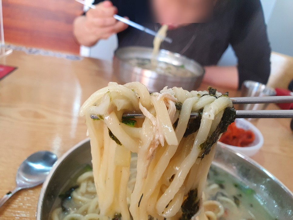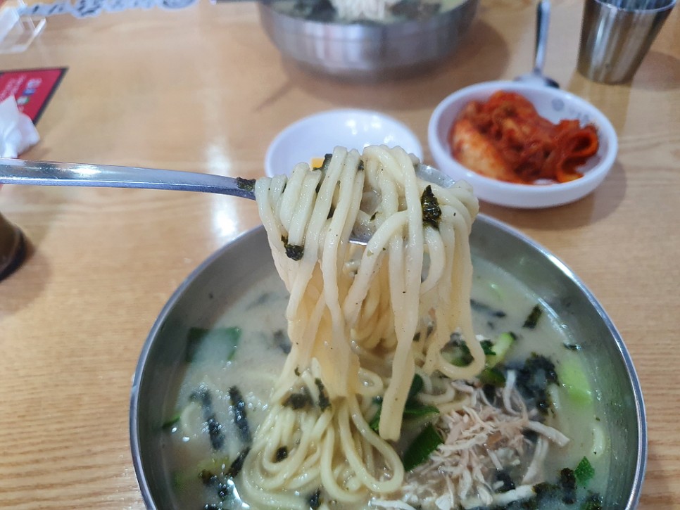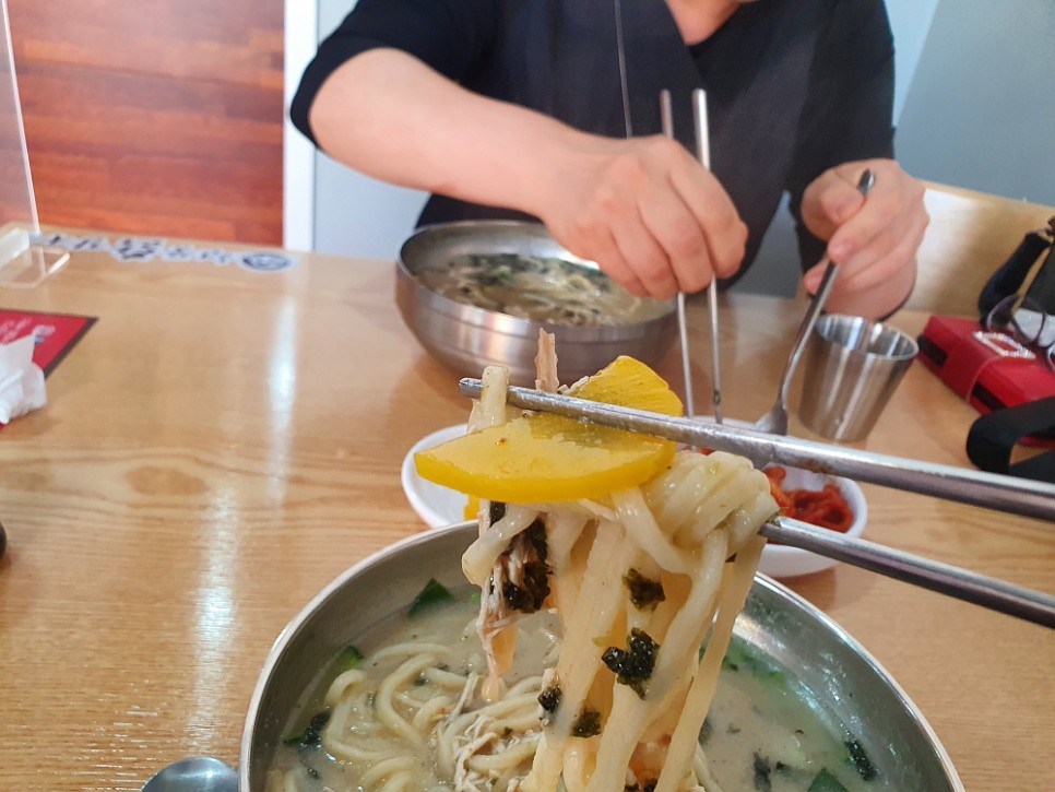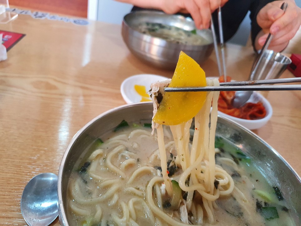 그런데 이것은 영 아니었다. 너무 맛이 좋았다. 아니 내공이 장난이 아니었다. 우린 원래 면 중에 칼국수를 유난히 좋아한다. 그만큼 입맛이 까다롭고, 평이 날카롭다고 자평하는 사람들이다. 하지만 별 기대하지 않고 들어 갔다가 뒷통수를 제대로 맞은 것처럼 띵 했다. 정말 말 그대로 너무 맛이 좋았다. 개인적으로 닭 국물을 무척 좋아하는데 닭 육수는 소고기나 돼지보다 느낌 상 좀 가벼우면서 익숙하고 그 감칠맛이 더 하다고 생각하는 편이다. 이집은 그런 나의 기대와 정말 제대로 부합되는 곳이었다. 가벼우면서 익숙하고 깊은 그 무엇이 있었다. 거기에 살짝 올려진 닭 고기 고명이 아주 일품이었다.