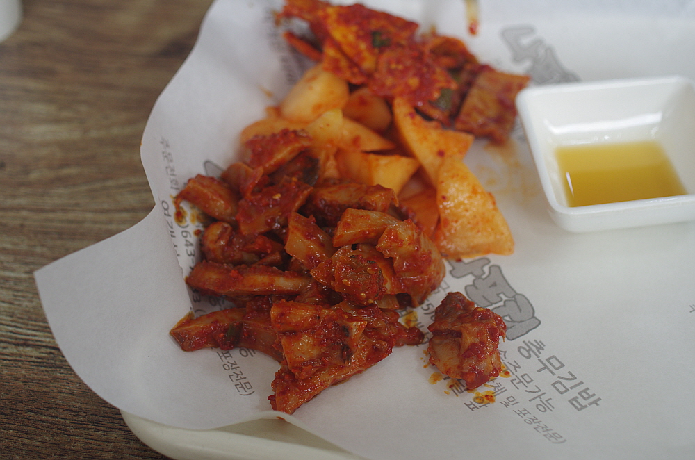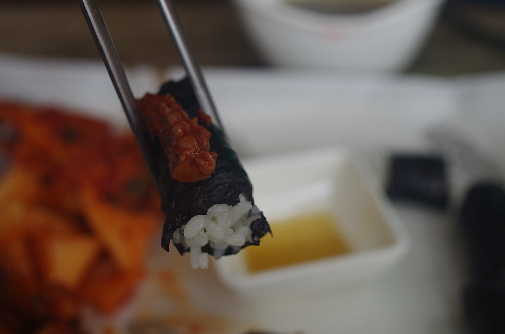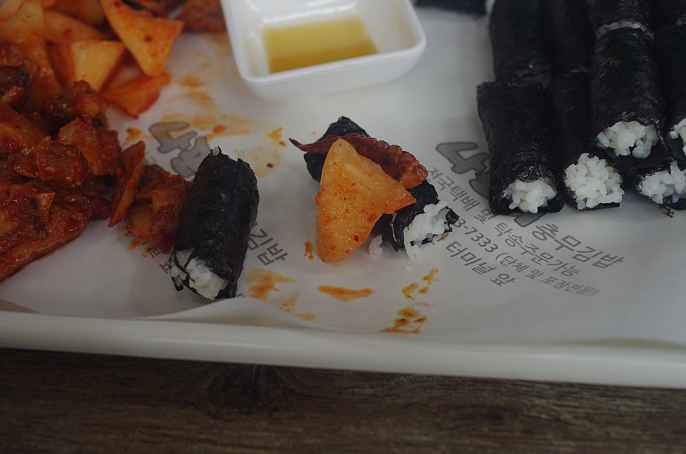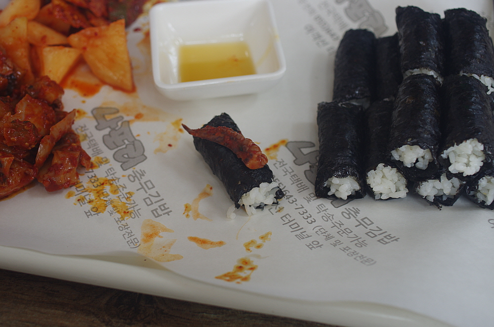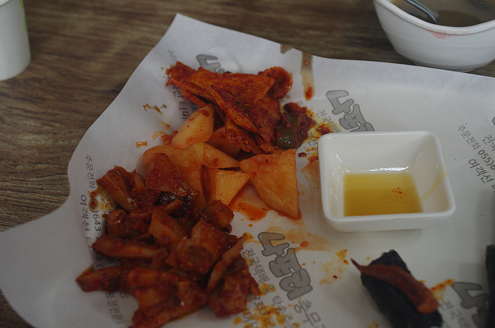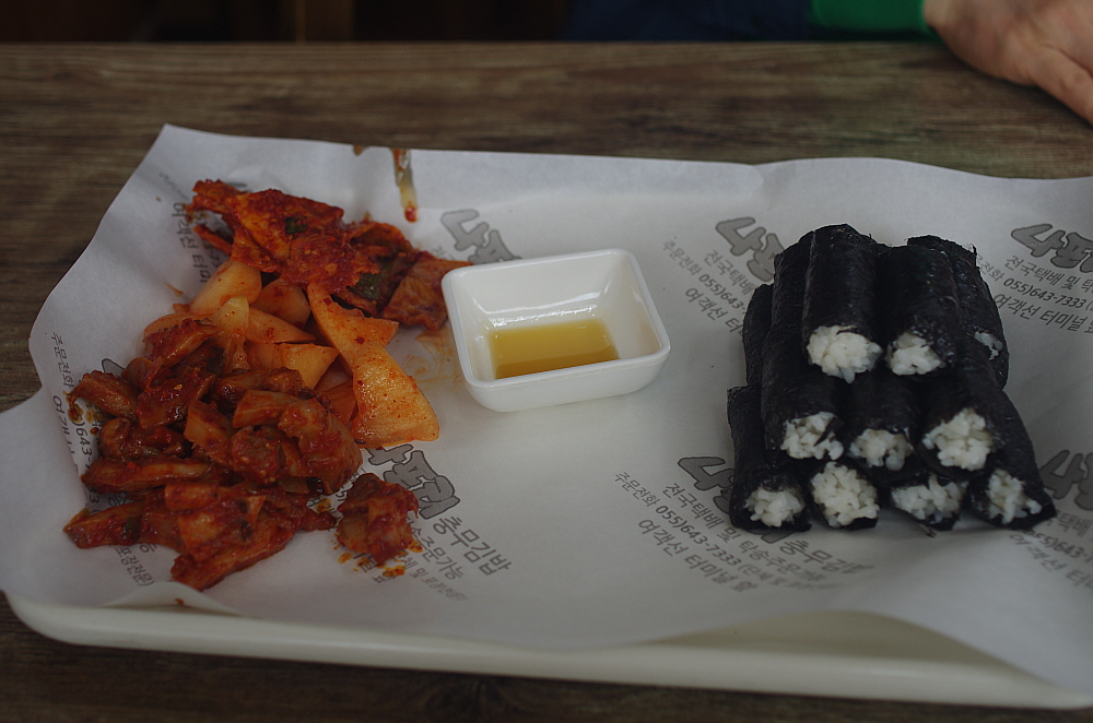 그렇게 나온 충무김밥은 참 볼 때마다 느끼는 것인데 참 단촐하다. 어부들이 허기를 달래기 위해 갑작스래 만든 것이 유래라는 말이 실감나는 비주얼이다. 그냥 날 김에 밥을 말고, 냉장고에 있던 석박지와 오징어무침, 그리고 차갑게 식은 어묵무침을 주면 되는 것이다. 김밥도 흔히 우리가 먹던 김밥처럼 참기름을 넣고 섞는다던지 하는 군더더기가 없는 단지 하얀 쌀밥을 말아 놓은 것이다. 꼬마김밥 비슷한 모양이지만 속엔 아무것도 들어간 내용물이 없다. 밥을 김과 함께 먹으면서 차게 식은 반찬을 함께 먹는 밥상인 것이다. 우리가 식당이 아니라 배위에 있었다면 단연 이해가 가는 세트구성이다.