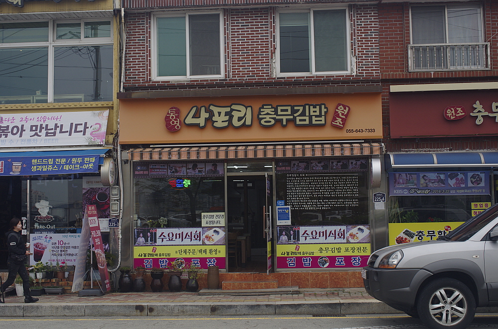 통영의 옛 지명이기도 한 충무라는 단어가 들어간 가장 통영스러운 음식이 충무김밥이다. 전국 어디에나 있는 것이 김밥이지만 충무 김밥은 정말 통영에만 있는 것 같다. 어쩌면 호불호가 가장 많이 갈리는 음식이기도 하다. 누구는 별 맛이 없다 하지만 누군가는 통영을 대표하는 맛이라 극찬을 한다. 개인적으로는 전자와 비슷했다. 하지만 통영에 왔다면 아무리 취향이 아니라 해도 먹어봐야 한다. 적어도 한 번은 현지에서 먹고 나서 평을 하더라도 해야 할 것 아닌가? 그래서 이날 아침은 일부러 충무김밥집을 찾아 나섰다. 숙소 근처만 해도 수 십개의 충무김밥집이 있었다.