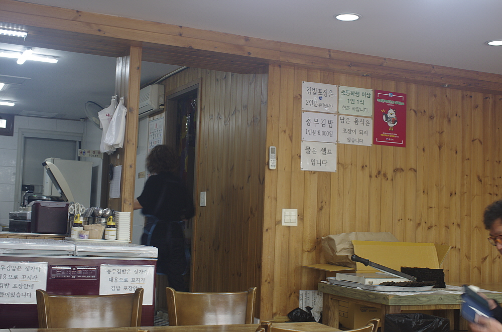 눈에 보기에 혹 하는 집이 있어 가게 되었다. 수요미식회에 나온 집이란다. 그놈에 언론이 뭔지... 그 문구가 신경이 쓰여 다른 집은 눈에 들어 오지 않았다. 매스미디어의 무서운 힘이다. 막상 들어오니 아침 시간이라 그런지 주인장이 한창 장사 준비를 하고 있었다. 그래도 손님을 보니 김밥을 달라는 것이냐며 부리나케 주방으로 들어갔다. 별다른 메뉴도 없는 집인지라 우린 머릿수대로 충무김밥을 주문했다. 여기서는 달리 뭘 고르고 자시고 할 것도 없는 셈이다. 조금 기다리라면서 주방으로 간 주인장은 이내 김밥 세트를 들고 나왔다. 하긴 충무김밥이 만드는데 시간이 한참 걸리는 음식은 아니지 않은가?