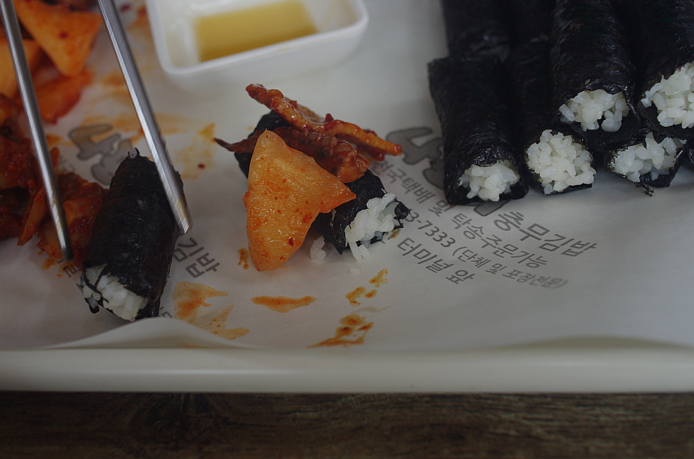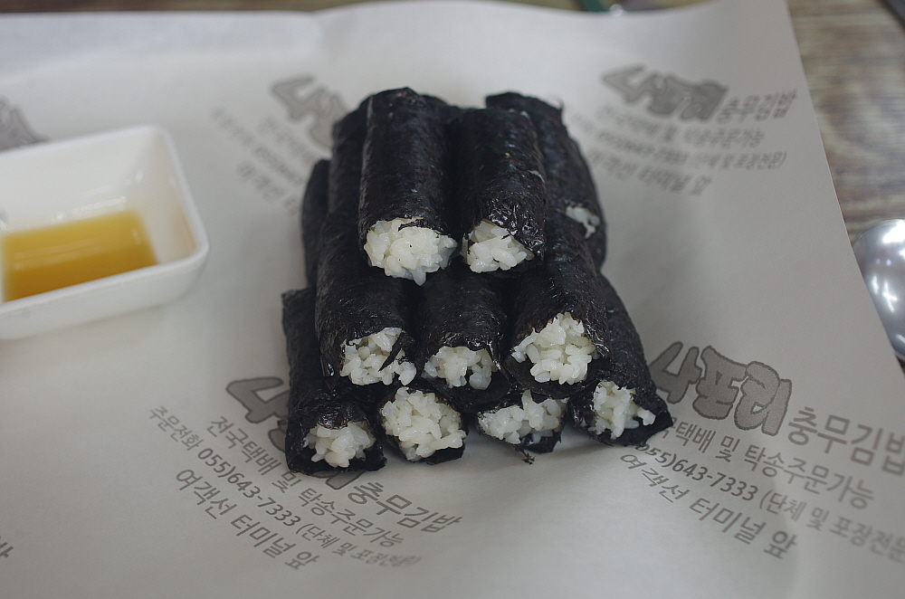 그렇게 나온 충무김밥은 참 볼 때마다 느끼는 것인데 참 단촐하다. 어부들이 허기를 달래기 위해 갑작스래 만든 것이 유래라는 말이 실감나는 비주얼이다. 그냥 날 김에 밥을 말고, 냉장고에 있던 석박지와 오징어무침, 그리고 차갑게 식은 어묵무침을 주면 되는 것이다. 김밥도 흔히 우리가 먹던 김밥처럼 참기름을 넣고 섞는다던지 하는 군더더기가 없는 단지 하얀 쌀밥을 말아 놓은 것이다. 꼬마김밥 비슷한 모양이지만 속엔 아무것도 들어간 내용물이 없다. 밥을 김과 함께 먹으면서 차게 식은 반찬을 함께 먹는 밥상인 것이다. 우리가 식당이 아니라 배위에 있었다면 단연 이해가 가는 세트구성이다.