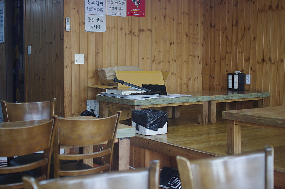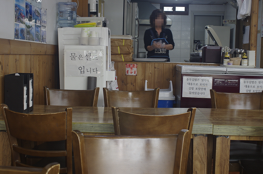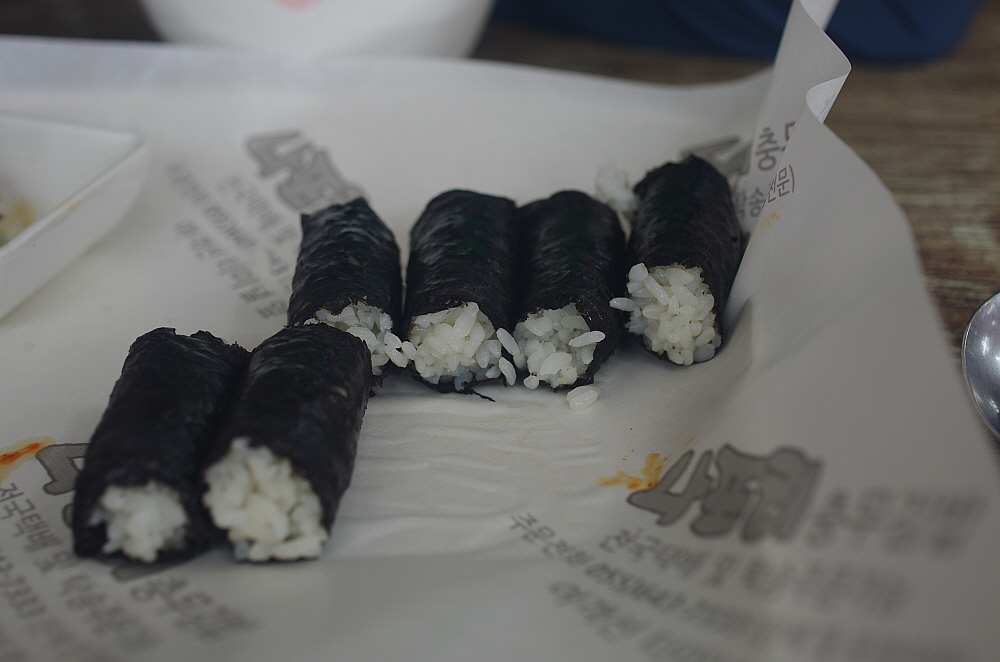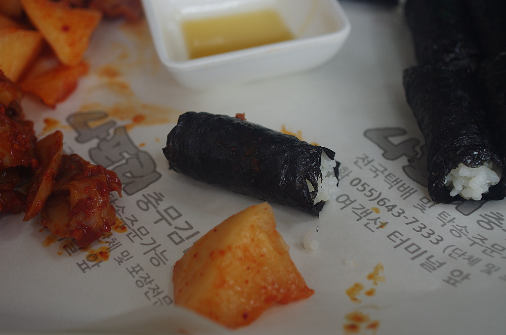 그래도 우리가 앉아 있는 테이블 건너편 주인장이 작업하던 테이블을 보니 엄청난 양의 김을 자르고 있는 모습이 눈에 띄였다. 족히 수 백인분은 되어 보임직한 양이었다. 과연 저렇게 많은 양의 김밥이 하루에 나가는 것일까? 금새 눅눅해지는 김의 특성을 생각할 때 분명 오늘 자른 김을 몇 날을 두고 팔지는 않을 것이다. 그렇게 생각하면 통영 사람들이 참 충무김밥을 많이들도 먹는 것 같다. 먹다보니 그런 생각도 들었다. 이렇게 단촐하면서 편리한 김밥은 그냥 집에서도 얼마든지 먹을 수 있는 것 아닐까? 이젠 아침으로 집에서 충무김밥을 만들어 먹는 것도 고려해 봄직하다는 생각 말이다.