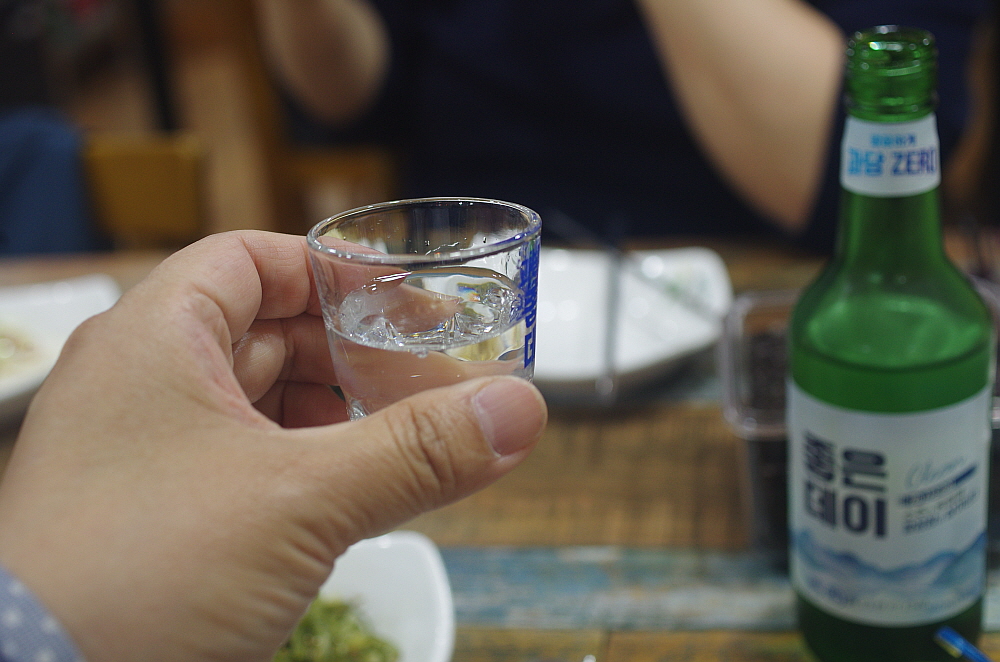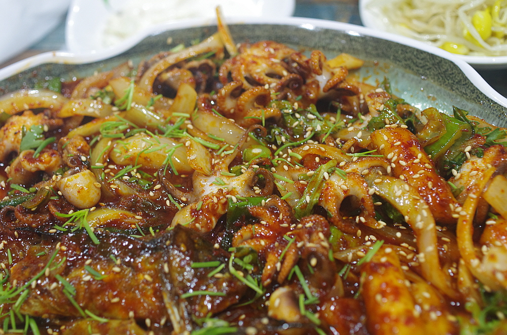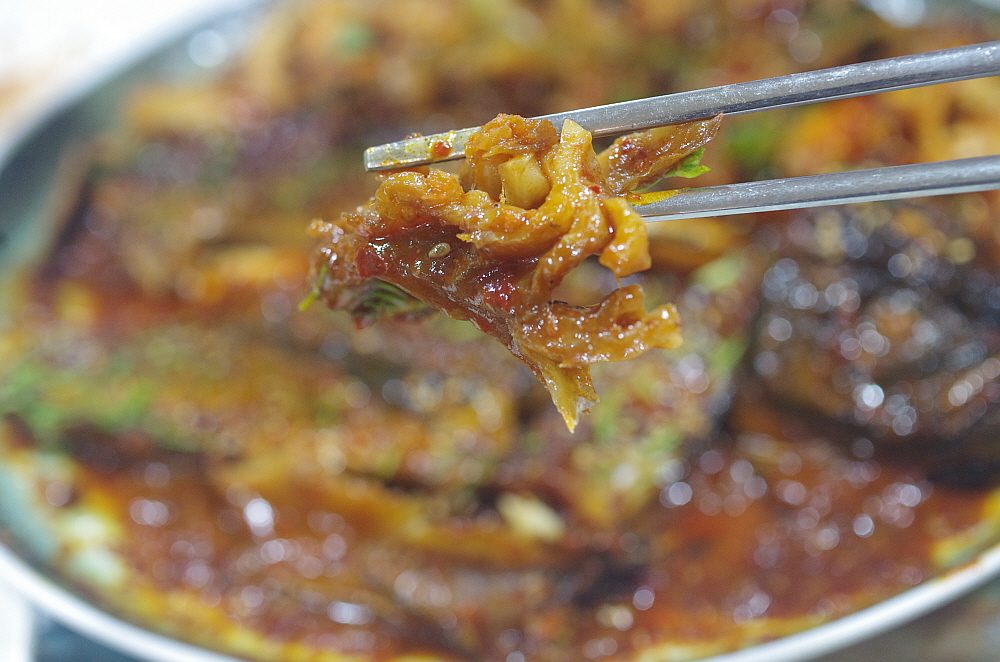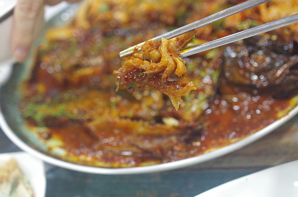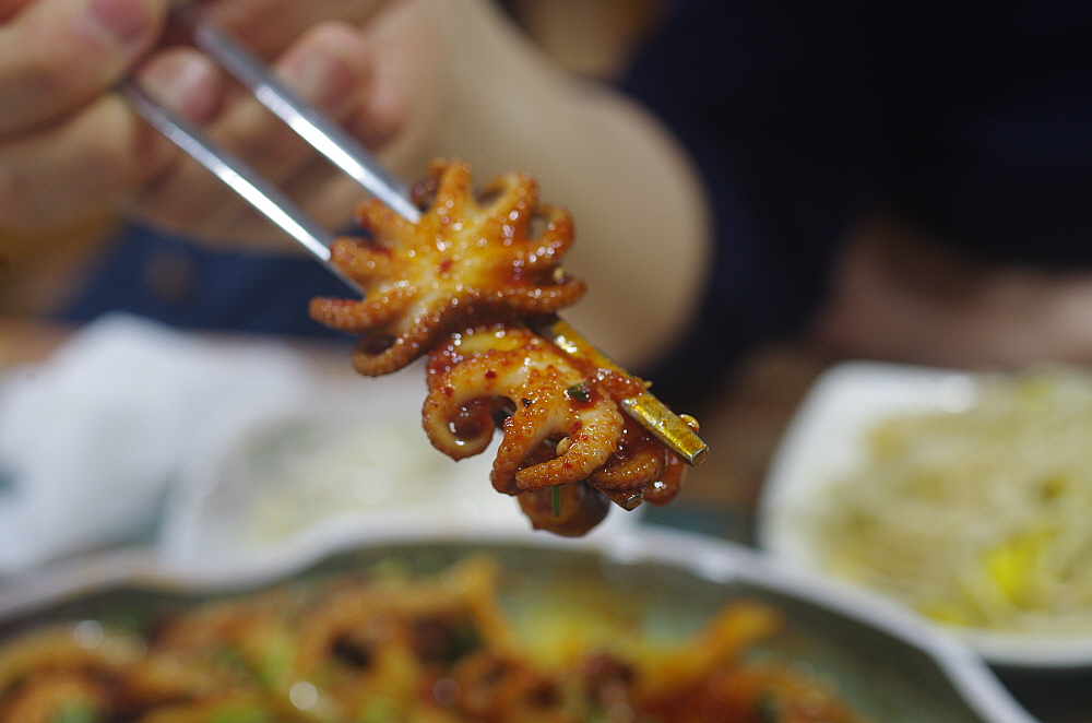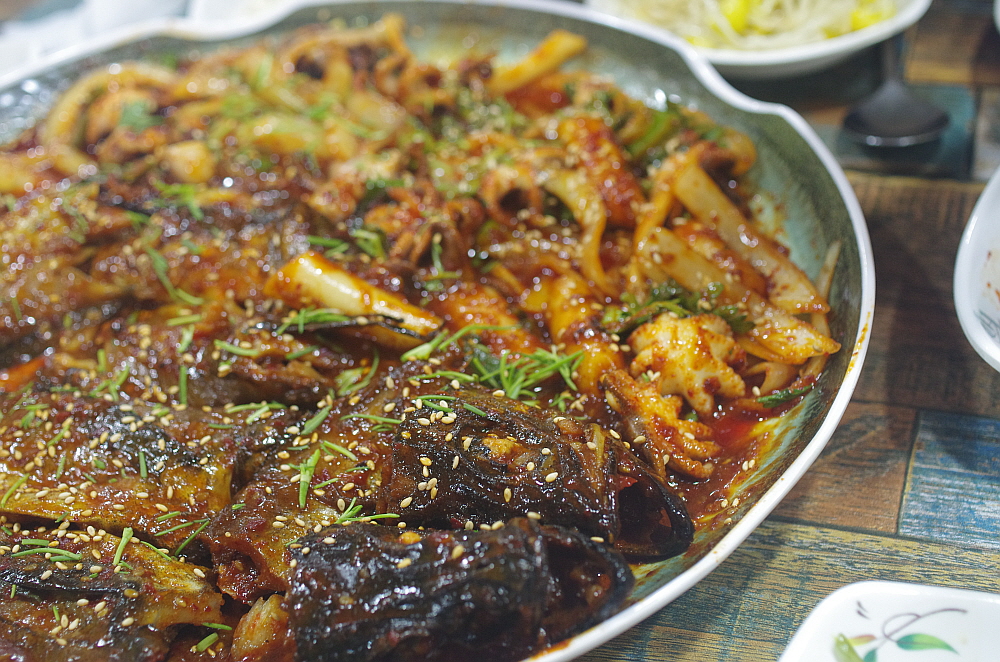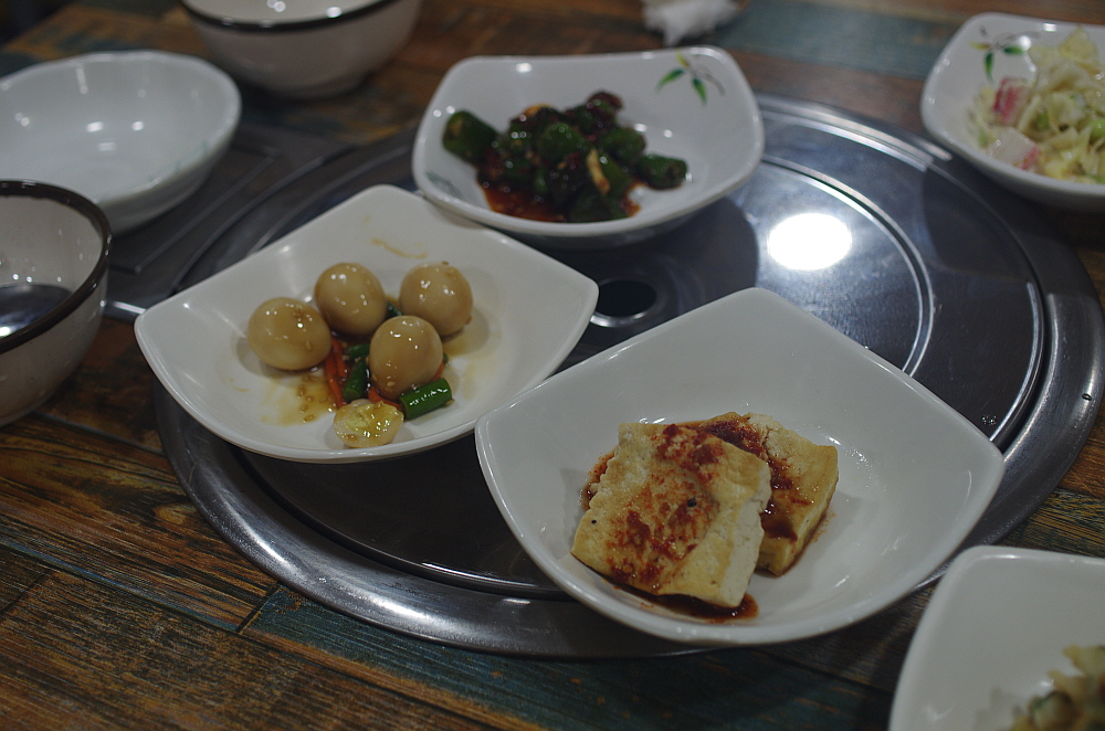 그렇게 앉아 있다 보니 음식이 나왔다. 말이 조림이지 우린 코다리 볶음이나 찜 비슷한 비주얼을 상상했었다. 하지만 나온 코다리 조림은 우리가 예전에 봤던 코다리 찜과는 사뭇 다른 모습이었다. 정말 바짝 조린 명태였다. 당연히 맛이 강하고 짰다. 거기에 쭈꾸미도 좀 사이즈가 작고 역시 나 짰다. 맛이 없는 것은 아니지만 기대한 것과 달라 조금은 의아했다. 하긴 그래도 이런 짭조름한 반찬이 술안주로는 더 잘 어울리는 법이다. 이런 반찬이 나오면 서둘러 잔에 술을 채우게 된다. 누가 뭐래도 술 한 잔 마시고 강렬한 맛이 살아 있는 안주를 먹는 것이다. 우리네 술이란 것이 결국 음식이 아니던가?
