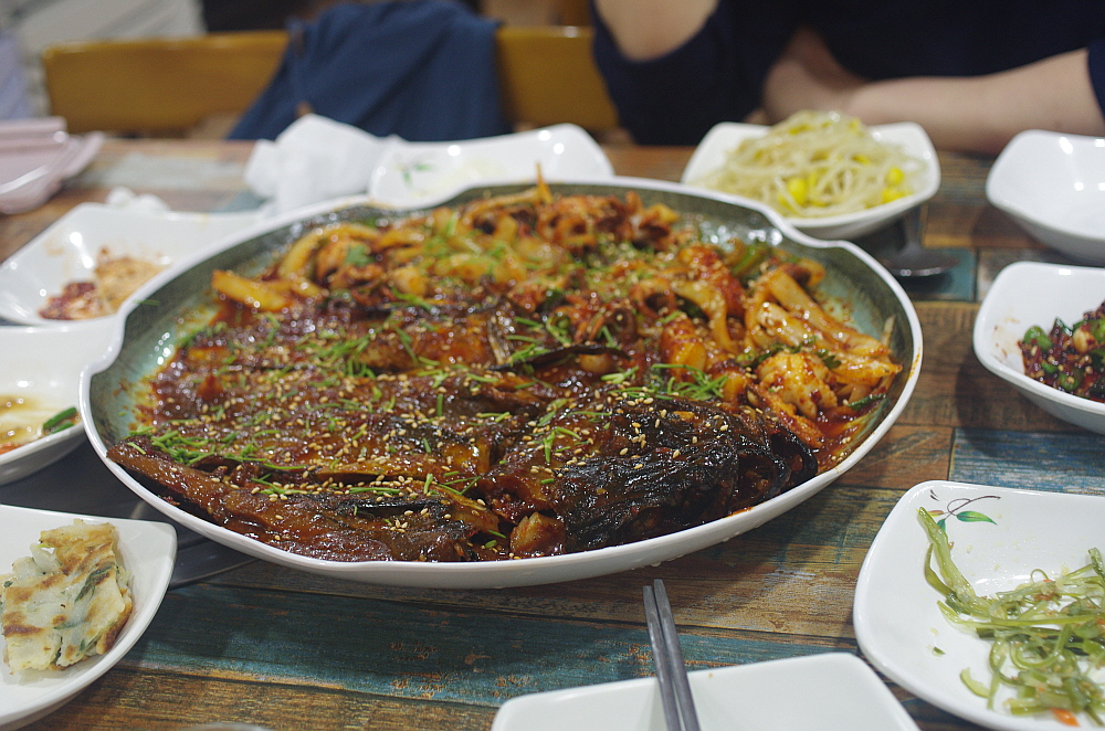 둘째 저녁은 좀 더 현지인들이 가는 식당에서 저녁을 먹고 싶었다. 강구안이라는 지역이 통영에서도 아주 유명한 곳이고 외지에서 찾는 이들이 많은 지역이다 보니 아무래도 관광지 같은 분위기가 많이 난다. 우리는 다리가 아프더라도 이 근방을 벗어난 현지들이 자주 갈법한 식당을 찾기로 했다. 한 30~40분 정도 걷다보니 정말 관광지답지 않은 낮에는 직장인이 많을 것 같은 동네가 나왔다. 나중에 지도를 보니 거기가 거기이긴 했다만 그래도 우린 나름 강구안을 벗어나려고 애썼다. 아무튼 그래서 돌다 만난 집이 바로 이집이다. 정량동의 코다리 김명태 라는 집이다.