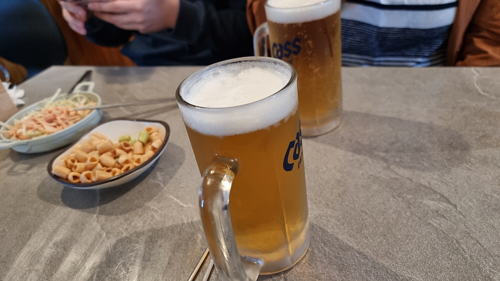 메뉴판의 가격을 보니 비싸다 하기도 그렇고, 저렴하다 하기도 그렇고 중간쯤 되는 가격인 것 같았다. 아무래도 배달을 전문으로 하는 통닭집은 아니다 보니 가격을 이런 선에서 정했는 모양이다. 우린 시그니쳐라 할 수 있는 후라이드 반, 양념 반치킨과 생맥주를 주문하고 기다렸다. 젊은 여자 주인장 혼자 장사를 하는 곳이다 보니 아무래도 닭을 튀기는데 시간은 좀 걸렸다. 하지만 생맥주와 호프집에만 오면 그렇게 먹게 된다는 양배추 샐러드를 먹으면서 기다렸다. 양배추가 몸에 좋은 것을 알면서 집에선 좀처럼 먹기 힘든데 이렇게라도 먹어야 하지 않겠는가?