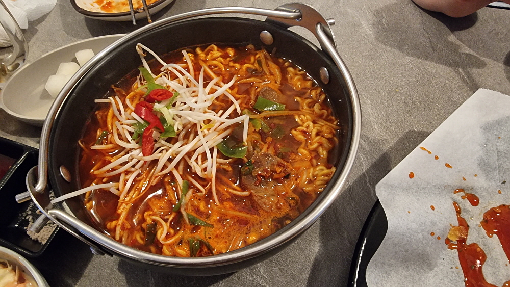 평소 통닭을 그리 즐기지 않는 편인데도 이날은 참 많이 집어 먹었다. 사람 셋이 먹으니 통닭 한 마리는 정말 순식간에 사라졌다. 하지만 여기서 또 닭을 주문하기는 그렇고, 이미 주종도 소주로 바꾼 상태라 메뉴에 있는 얼큰한 해장라면을 먹기로 했다. 라면 한 그릇이 7,000원 이면 결코 싼 값은 아니지만 이런 술집에서 먹는 얼큰한 라면 한 그릇은 또 다른 라면의 세계라 하겠다. 정말 주인이 라면을 끓이는 동안에도 냄새가 식당 안에 가득하여 참기 힘들 정도였다. 뭔 라면을 사용하냐고 묻고 싶었으나 그냥 나온대로 불기 전에 언능 먹기로 했다. 그것이 라면을 대하는 진심이리라.