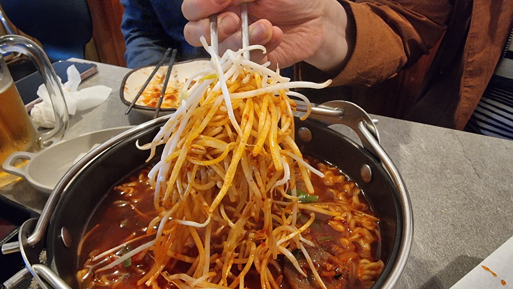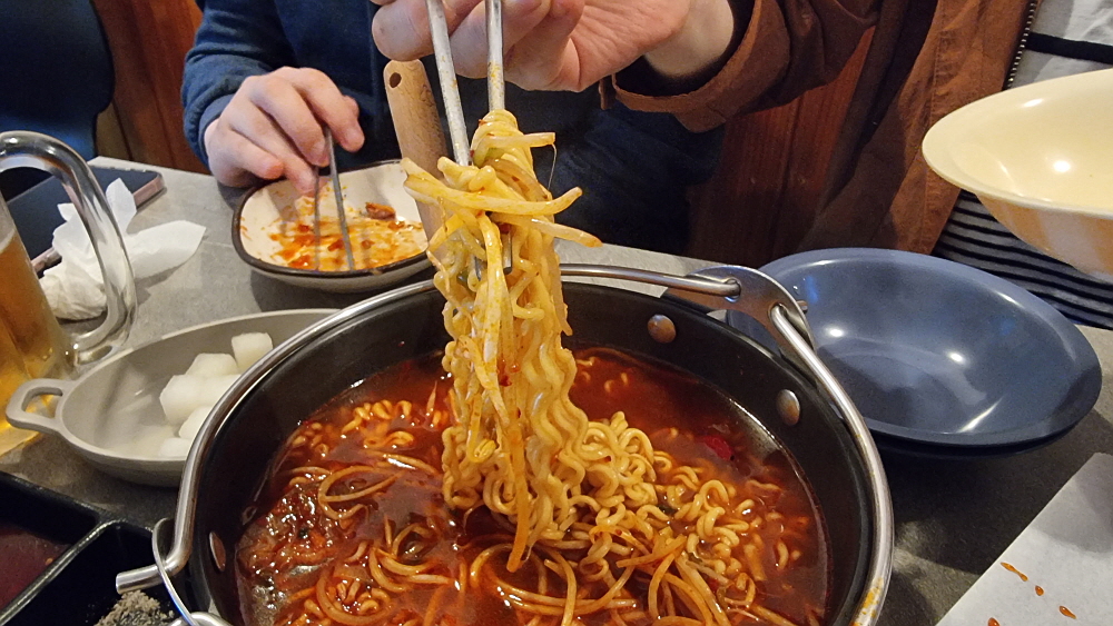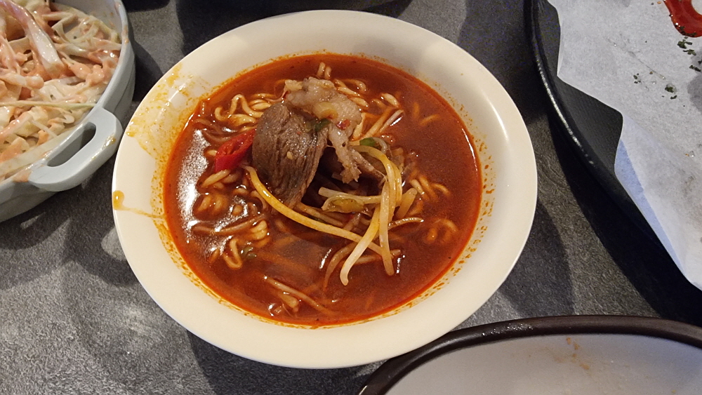 평소 통닭을 그리 즐기지 않는 편인데도 이날은 참 많이 집어 먹었다. 사람 셋이 먹으니 통닭 한 마리는 정말 순식간에 사라졌다. 하지만 여기서 또 닭을 주문하기는 그렇고, 이미 주종도 소주로 바꾼 상태라 메뉴에 있는 얼큰한 해장라면을 먹기로 했다. 라면 한 그릇이 7,000원 이면 결코 싼 값은 아니지만 이런 술집에서 먹는 얼큰한 라면 한 그릇은 또 다른 라면의 세계라 하겠다. 정말 주인이 라면을 끓이는 동안에도 냄새가 식당 안에 가득하여 참기 힘들 정도였다. 뭔 라면을 사용하냐고 묻고 싶었으나 그냥 나온대로 불기 전에 언능 먹기로 했다. 그것이 라면을 대하는 진심이리라.