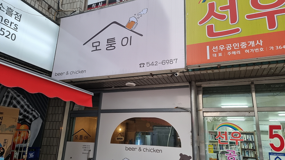 상운아파트 상가에는 오래된 치킨집이 두 개 있다. 그 중 하나가 최근 새로 주인이 바뀌면서 문을 열었다. 말 그대로 집에서 편하게 운동복 입고 갈 수 있는 동네 호프집이 하나 생긴 것이다. 이름은 모퉁이 라는 호프집이다. 이 가게 위치게 모퉁이기 때문에 그렇게 이름을 붙인 것 같다. 젊은 주인이 새로 오픈한 곳이다 보니 인테리어가 젊은 감각이다. 작은 호프집이지만 왠지 그전보다는 뭔가 세련된 것 같고, 맛도 더 좋을 것 같은 치킨집이라 찾아가 보기로 했다. 일요일에는 문을 닫는 것 같았고, 평일 저녁에 가야 제대로 된 영업 시간을 맞출 수 있는 것 같았다.