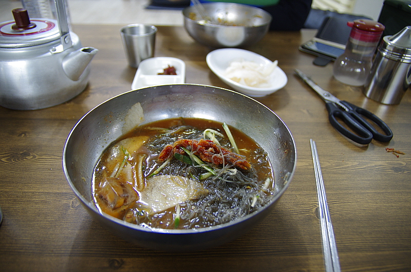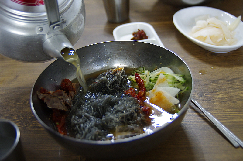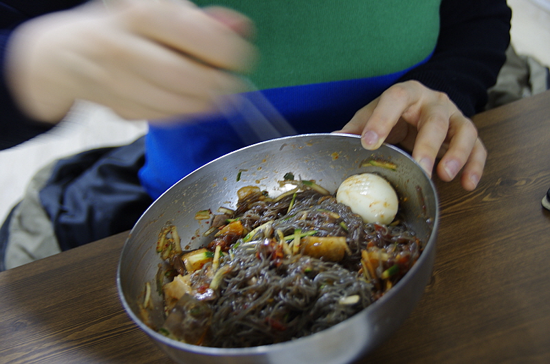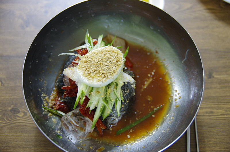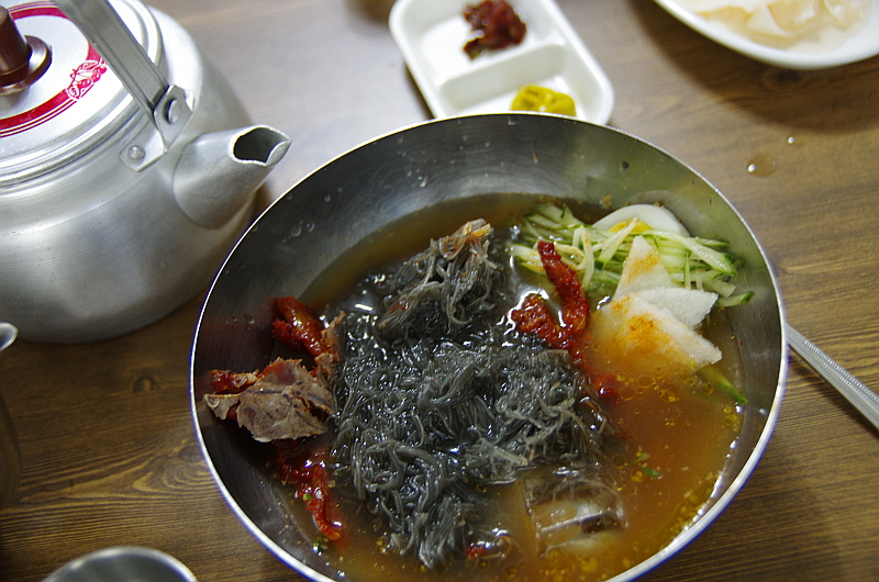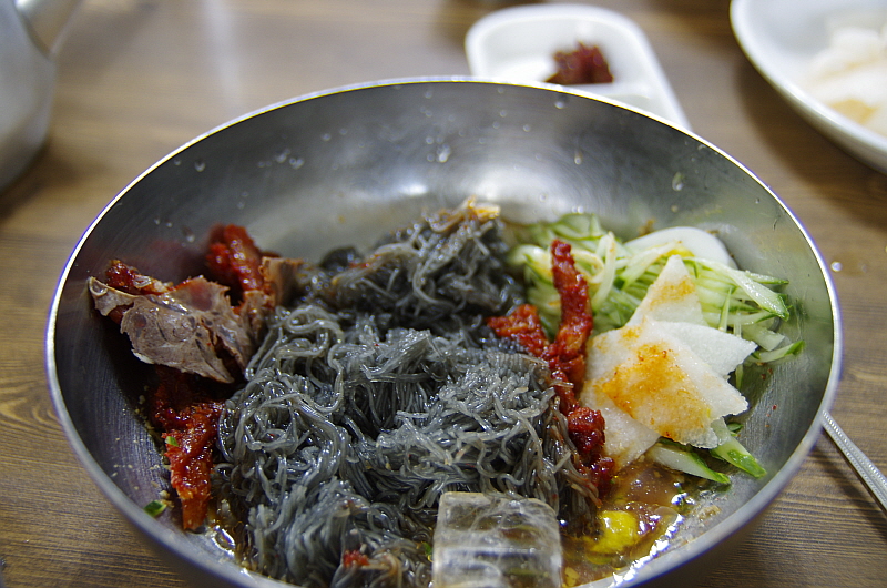 얼마간 기다리니 드디어 우리의 목표인 냉면이 등장했다. 면의 색이 조금 진한 것이 눈에 띄였고, 튼실하게 명태와 소고기가 고명으로 들어 있었다. 양념의 색이 하도 강렬해서 매울 것 같지만 실제 먹어 보면 그렇게 자극적이진 않았다. 고기 외에도 여러 야채와 배가 들어 있었다. 그리고 눈에 띈 것은 저 얼음이었다. 냉면이라는 아이템에 충실하기 위해 밖이 영하의 날씨라 해도 여긴 얼음을 넣어주는 저 충실함... 그 얼음을 봤더니 다시 몸이 떨리는 느낌이었다. 방바닥은 뜨끈했는데 계속 몸은 떨렸다. 그래 이런 맛에 겨울 냉면을 먹는거지 싶었다.