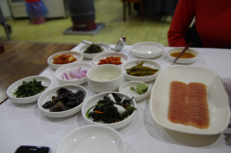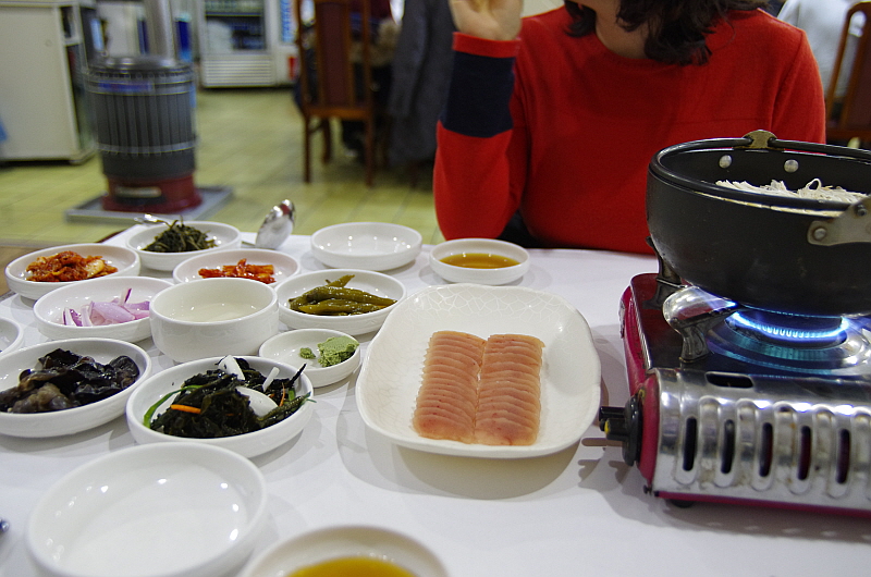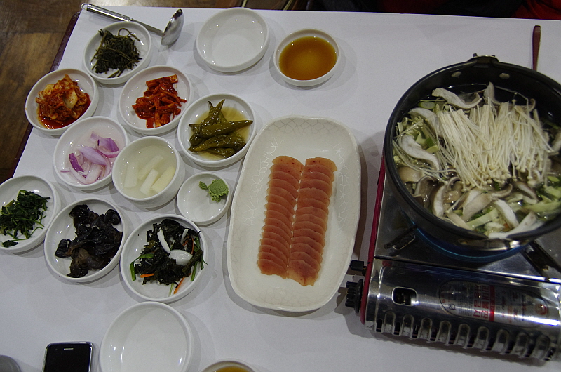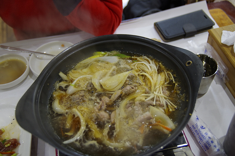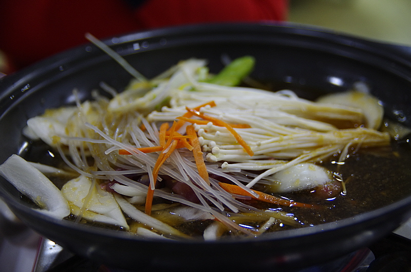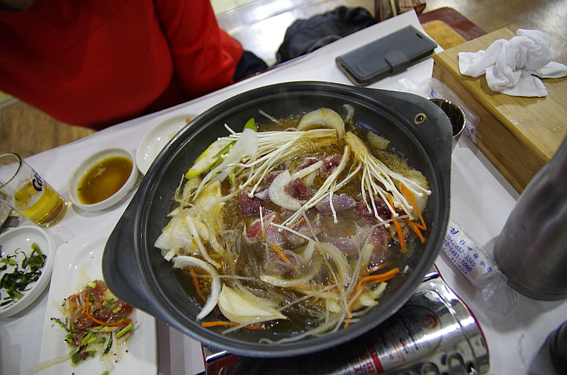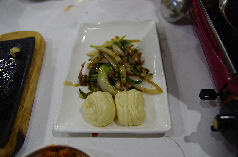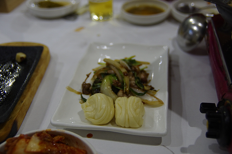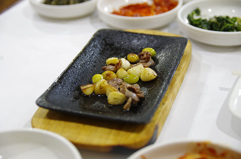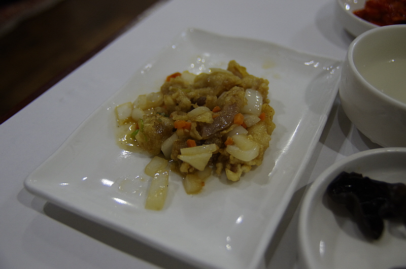 슬슬 배가 불러 오는데 주인아주머니는 그런 나의 약점을 노리고 치고 들어 오듯 바로 음식을 또 내왔다. 이번엔 뀡불고기라고 했다. 뀡고기는 살이 너무 부드럽기 때문에 이렇게 불로 익히는 요리들은 대부분은 살코기가 아니라 근위나 내장 부위를 사용한 것 같았다. 달달하고 부드러운 식감이 참 괜찮았다. 사실 너무 달아 남겨 두었던 육회를 여기 넣어서 같이 익혀 먹었다. 그랬더니 오히려 맛이 더 잘 어울렸다. 역시 나는 참 단 음식을 싫어하는 사람 맞다.