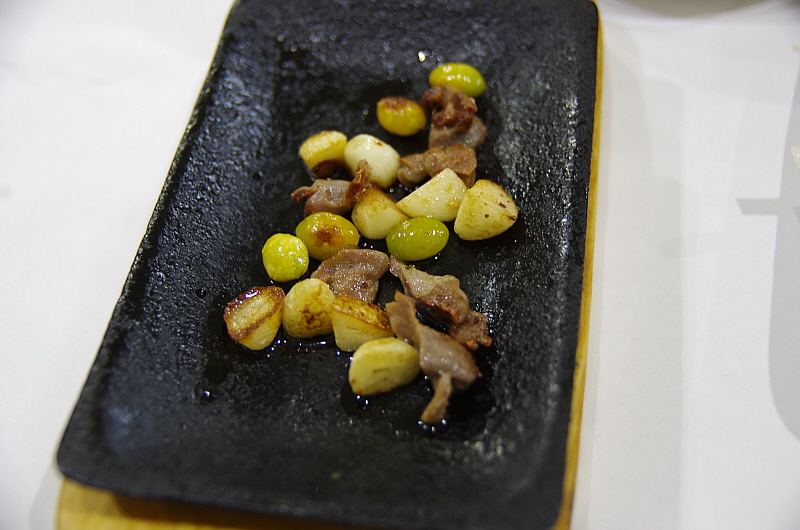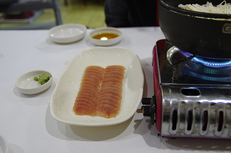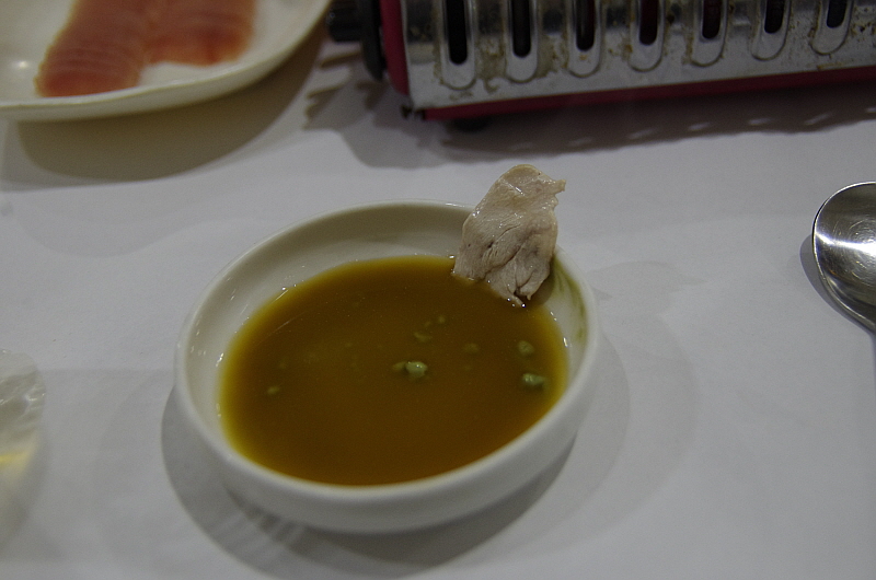 아무튼 가장 먼저 나온 것은 뀡고기 사브사브였다. 역시 뀡요리하면 이것이 대명사 일 것이다. 과거의 기억을 더듬으며 과연 맛이 어떨까 무척이나 기대하며 먹었다. 하지만 결론적으로 말하자면 내가 기억하는 그 야들야들하고 고소한 뀡고기 맛하고는 조금 거리가 있었다. 생고기가 아니라 냉동 고기인 것 같았다. 하긴 수급이 잘 안 되면 이렇게 냉동한 고기를 사용할 수도 있다. 하지만 좀 기대와 달라 실망스러웠던 것은 사실이다. 그래도 담백한 뀡고기 특유의 식감은 살아 있어서 다행이었다.