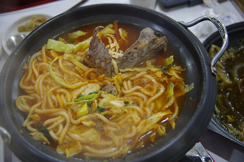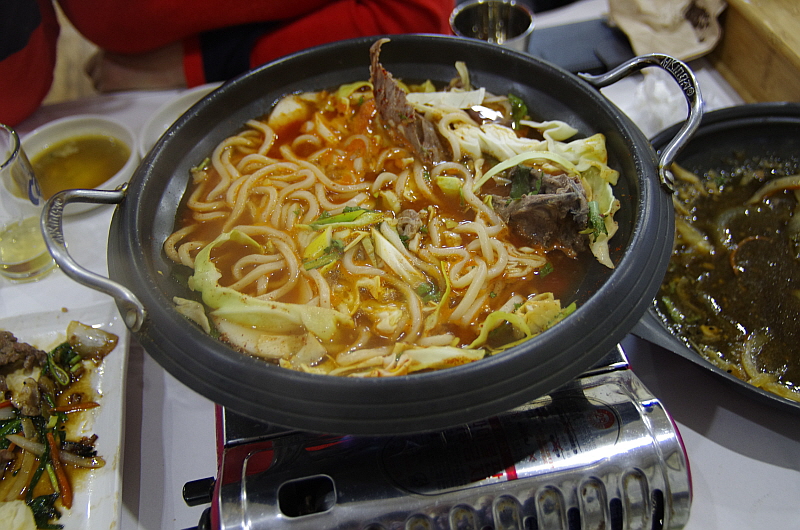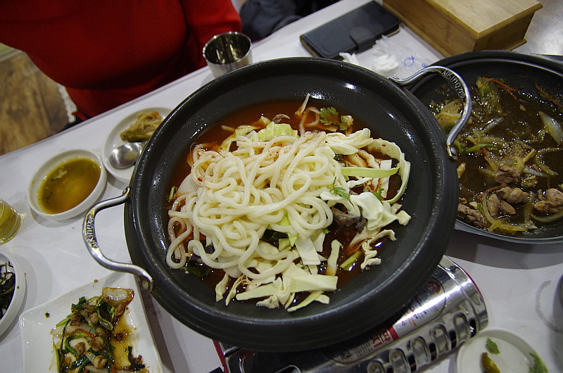 드디어 마지막 요리는 매운찌개였다. 마치 오리 고기를 구워 먹으면 나오는 오리탕 같은 느낌의 뀡탕이었다. 거기에 보기에도 탐스러운 굵은 우동면을 넣어 준다. 평소 내가 얼마나 우동을 좋아하던가? 하지만 이건 정말 그림의 떡이었다. 도저히 먹을 수 없었다. 너무나 배가 불렀다. 마눌도 형편은 비슷해서 거의 손을 대지 못했다. 우린 이날 뀡고기로 단백질 제대로 보충한 셈이다.
