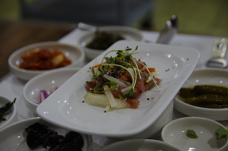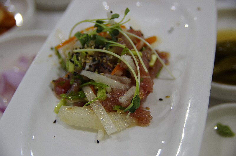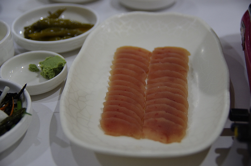 두 번째 요리는 뀡 육회라고 했다. 소고기 육회처럼 부드럽고 씹는 맛이 좋았지만 양념이 좀 과하다 싶게 단 것이 내겐 좀 부담스러웠다. 육회니까 어느 정도는 달아야 하겠지만 고기 자체의 맛을 음미하고 싶었는데 그것이 아쉬웠다.