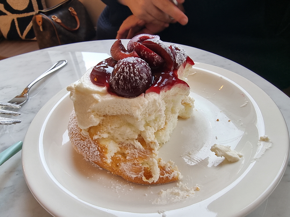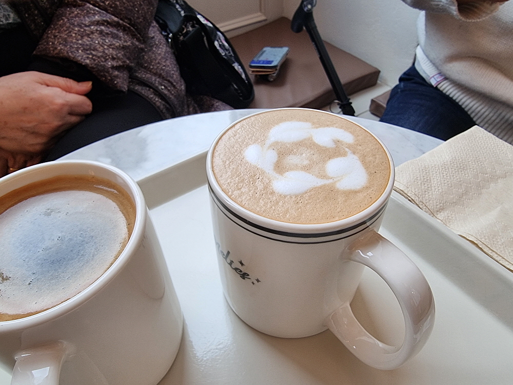 배가 부르다면서도 우린 또 한 컵 가득 따라진 커피를 받아 들었다. 라떼 한 잔은 결국 이만한 잔에 우유를 또 마신다는 말이다. 과연 밥배따로 디저트 배 따로 있나보다. 어쨌든 분위기 좋은 카페에 앉아 차 한 잔 마시는 여유는 참 즐거운 일이다. 이런 문화생활이 필요하기 때문에 다들 카페를 찾아 다니는 것이리라. 커피 맛이 비슷할 것 같지만 다들 조금씩 다르다. 여긴 약간의 산미가 들어간 일종의 복합적인 맛의 커피였다. 이런 커피가 고급이라 하던데 입이 싸서 그런가 그냥 고소함이 극대화 된 커피를 개인적으로는 더 좋아하기는 한다.