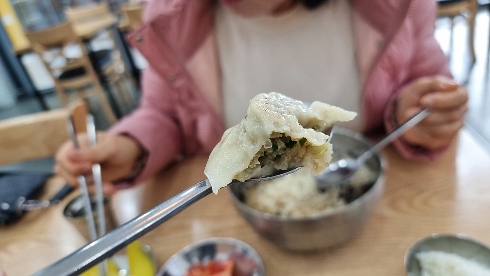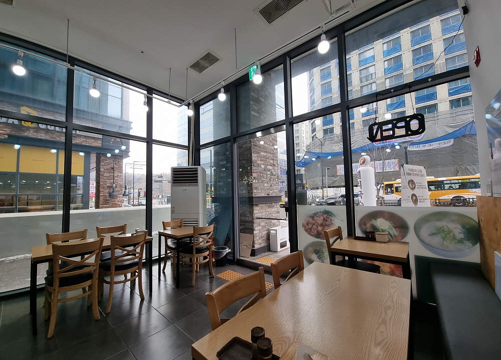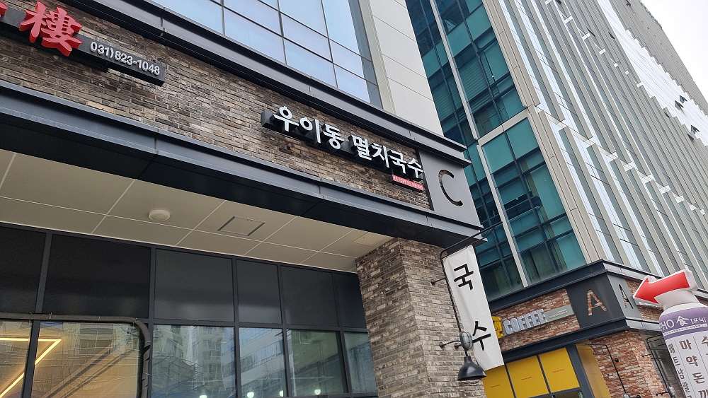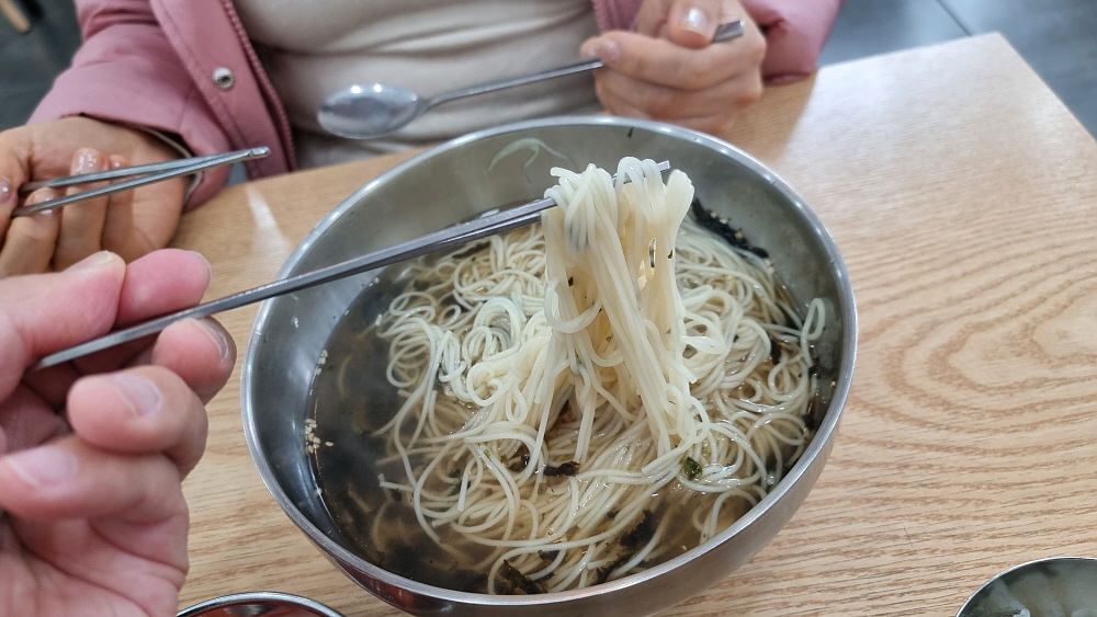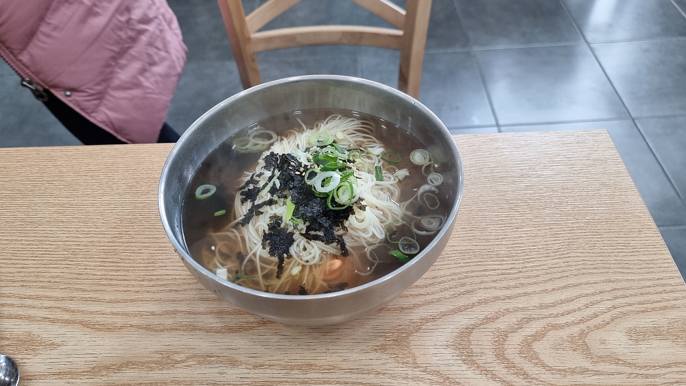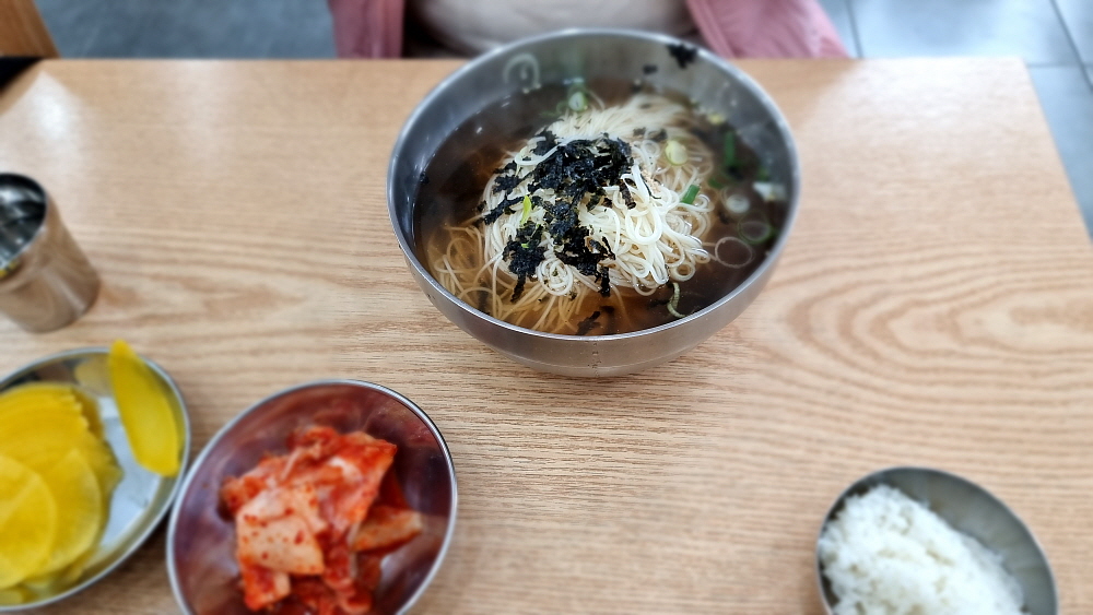 크지 않은 식당이라 주인장이 주방이며 서빙을 모두 하기 때문에 손님들은 셀프로 이것 저것 해야 한다. 주문도 키오스크로 하는 방식이다. 우린 떡만두국과 멸치국수를 주문하고 앉아서 기다렸다. 통창으로 밖이 훤히 내다 보이기 때문에 전망은 아주 좋은 편이다. 마치 테라스에 앉아 국수를 먹을 것 같은 그런 분위기이다. 토요일 오후 고산동은 무척이나 한산했다. 일종의 베드타운 느낌이라 사람들이 모두 집에서 쉬고 있는 모양이다. 깔끔한 건물만큼이나 실내가 깨끗한 국수집에서 한가롭게 밖의 풍경을 내다 본다는 것이 참 편안했다.