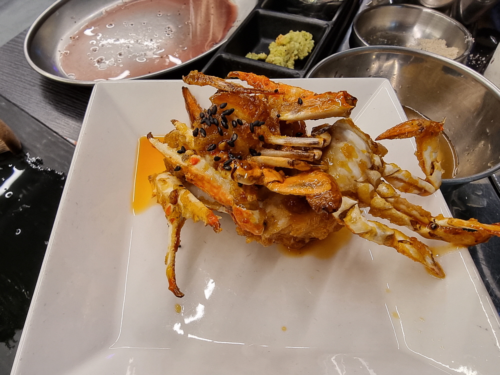 마지막엔 정말 특이한 서비스가 나왔다. 꽃게를 튀김처럼 만든 반찬이었다. 이런 꽃게튀김은 본적이 없다. 그런데 바싹하게 튀겨 낸 꽃게가 또 나름 맛이 있더라는... 곱창과 꽃게의 조화라~ 아무튼 모든 면에서 참 특이한 집이었다. 곱창 기름이 아까워서 우린 김치까지 볶아 먹었다. 만일 곱창이 좀 모자랐다면 여기에 밥도 볶았을 것이다. 하지만 그럴 필요는 없었다. 그렇게 두 어 시간 남짓한 우리의 넉넉한 곱창 파티는 끝났다. 맛나네...