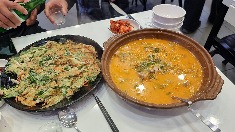 어찌되었든 먹기에 나쁘지 않았고, 안주로도 훌륭했다. 가성비가 엄청 좋은 집인 셈이다. 그래서인지 우리가 먹는 동안 배달 주문은 엄청 들어왔다. 연신 라이더들이 들락거렸다. 하긴 이런 음식이라면 집에서 주문해서 먹으면서 한 잔 하는 것도 나쁘지 않을 것 같다. 비교적 일찍 시작한 술자리인지라 안주보다는 소주병을 자꾸 들었다 놨다 했다. 뭔 이야기가 그렇게 진지한지 우리는 늘 만나기만 하면 할 얘기들이 많다. 다소 어울리지 않을 것 같았던 부추전과 술국은 꽤나 궁합이 잘 맞는 안주들이었다. 말 그대로 술이 쭉쭉 잘 들어갔다. 이러면 위험한데 말이다.