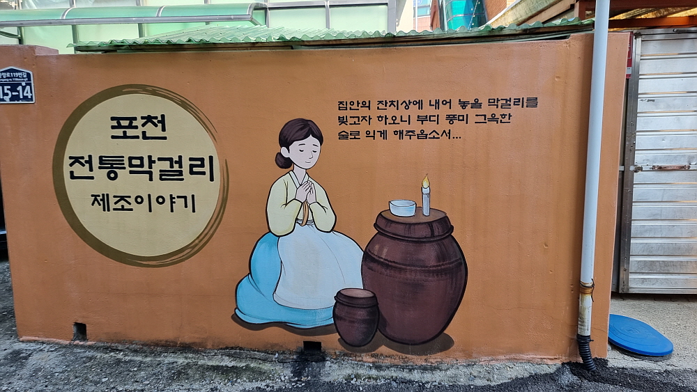 우연히 포천동 행정복지센터 앞의 골목길을 가다 전에는 보지 못했던 막걸리 벽화를 보게 되었다. 그림도 많지 않고, 벽화 길이도 짧은 편이지만, 벽화가 주는 메시지는 강렬했다. 과거 막걸리를 많이 먹었던 포천 사람들의 삶을 간단하지만 감동적으로 전해주는 그림이었다. 포천만 그러지는 않았겠지만, 예전의 포천 사람들은 막걸리를 참 즐겨 마셨다. 어릴 적 살던 동네인 신읍3리 부근은 아예 동네 이름이 ‘포천막걸리’를 줄인 ‘포막’이라 부르기도 했다.