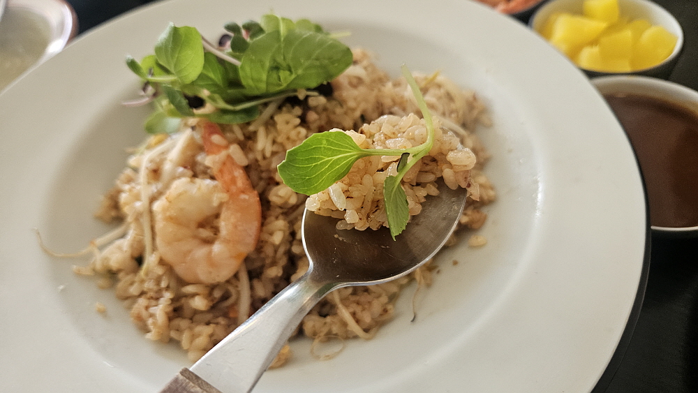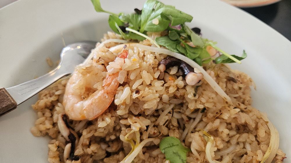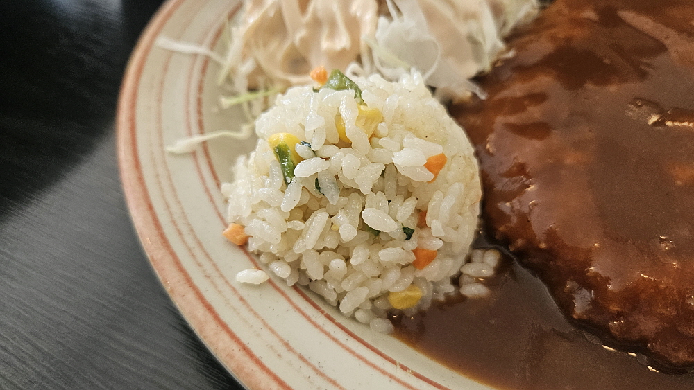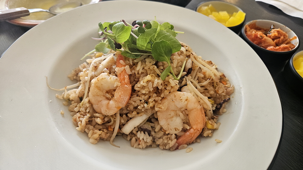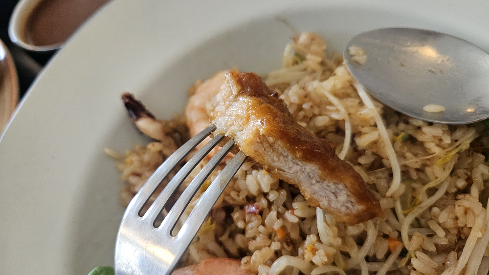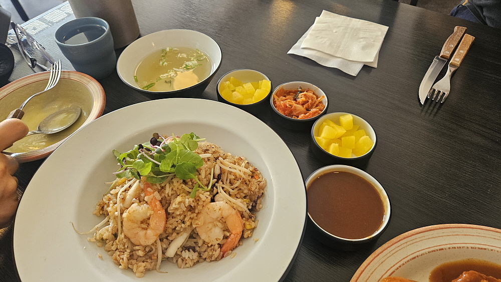 볶음밥이 역시나 맛이 진하고 좋았다. 밖의 날씨가 더운데도 이렇게 따뜻한 볶음밥에 자꾸 숟가락이 갔다. 어찌보면 자극적일 수도 있을 그런 강한 양념의 맛이었다. 커다란 새우와 함께 볶인 밥은 고슬고슬하니 씹는 맛이 일품이었다. 고명으로 올라간 저 파란 채소가 뭔지 잘 모르겠다. 돈가스의 고기를 조금 먹다가 다시 볶음밥을 먹는 루틴이 아주 좋았다. 과거 경양식집에서 먹었던 돈가스와는 전혀 다른 분위기와 양, 맛의 돈가스와 볶음밥이라 하겠다. 하긴 예전에 경양식 집에서는 볶음밥이 아니라 주로 오므라이스라는 볶음밥을 먹긴 했다.