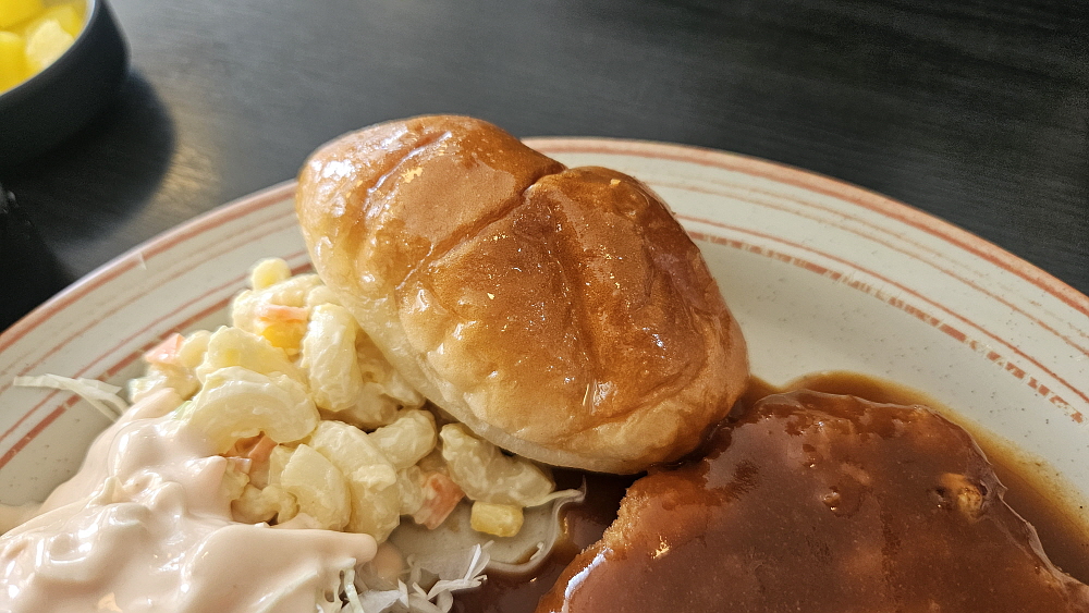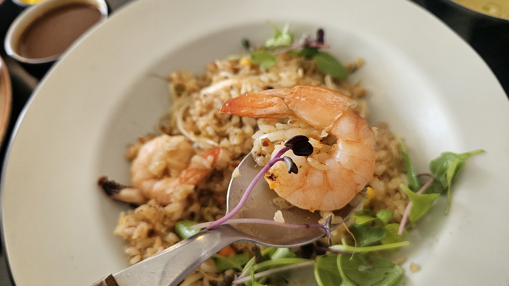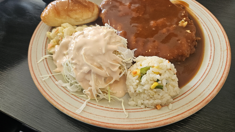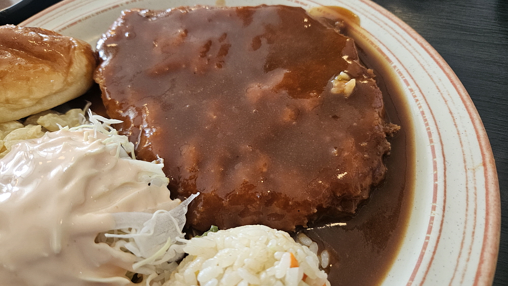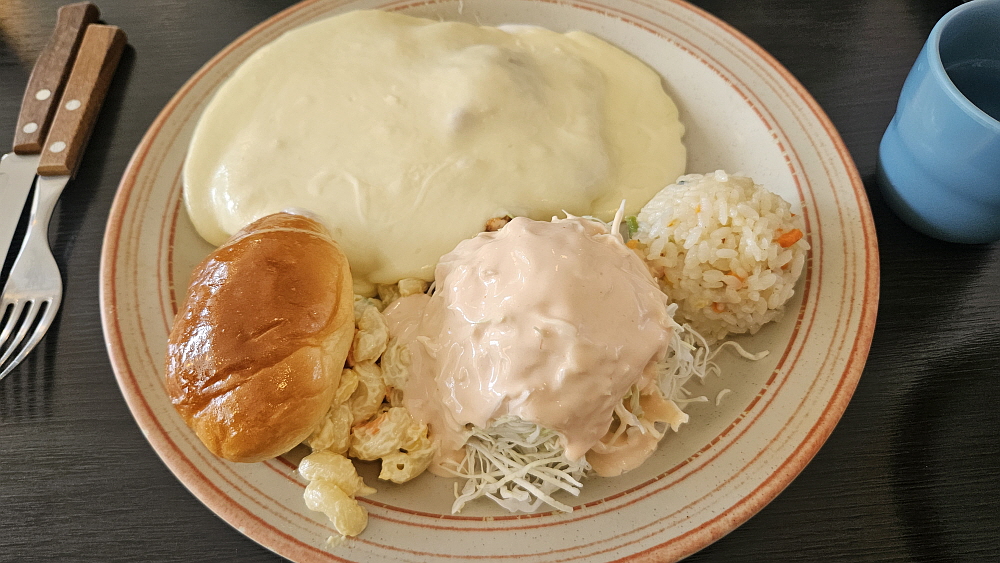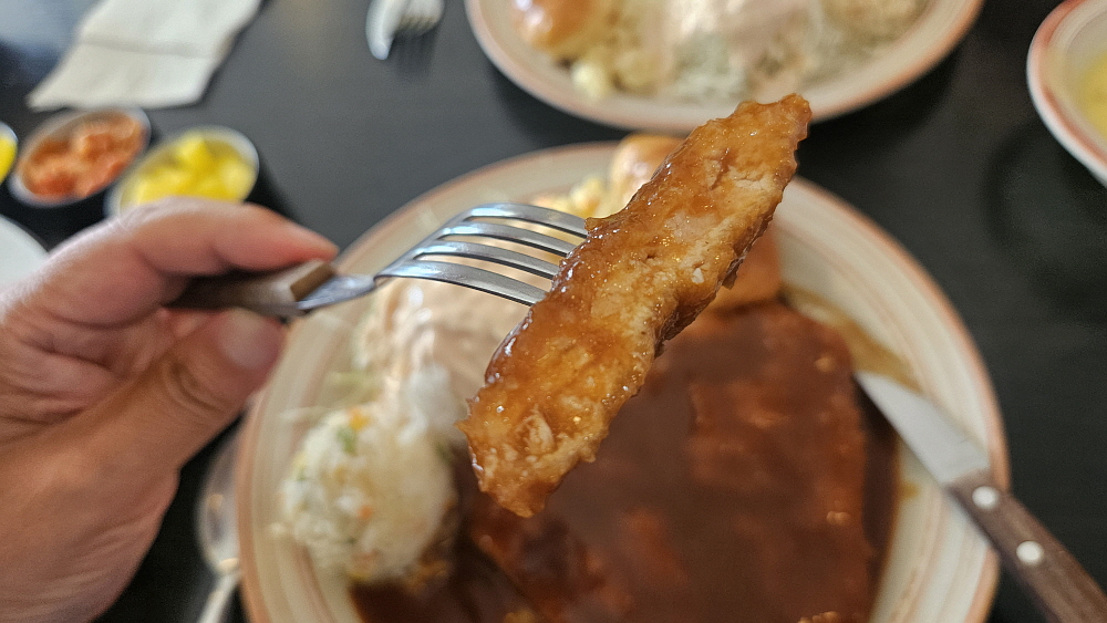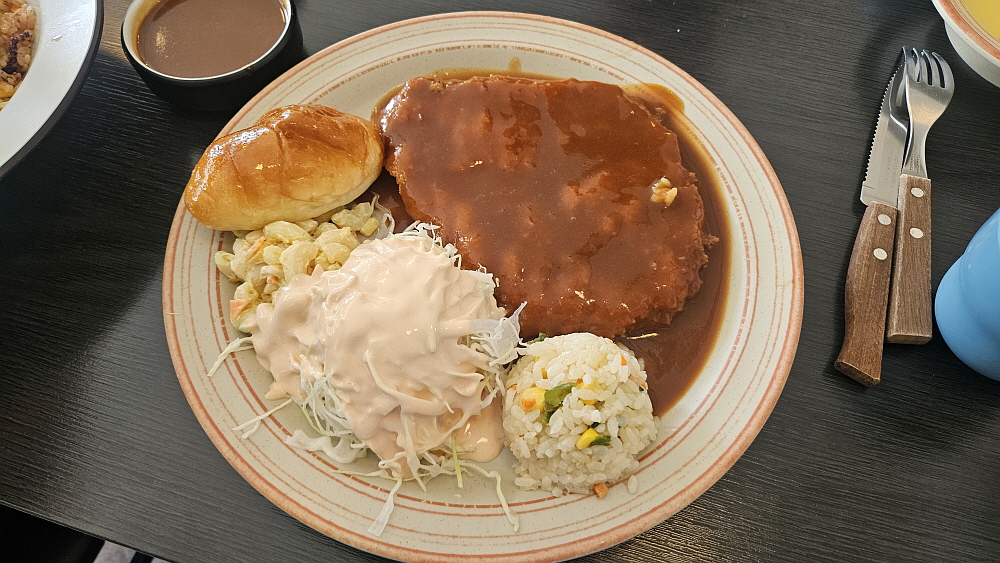 이집의 새우 볶음밥은 중국집의 그것과는 궤가 다른 음식이다. 웍에 놓고 볶는 것은 비슷한 방식이겠지만 맛이나 향은 많이 달랐다. 필라프에 더 가깝다고 말하는 것이 맞을 것 같다. 기름은 적고, 풍미는 올려 놓은 서양식 볶음밥이라 하겠다. 시그니쳐 돈가스는 우리가 상상 할 수 있는 바로 그 돈가스였다. 커다란 돼지고기 등심을 넓게 펼쳐 빵가루를 입히고 튀긴 전형적인 돈가스이다. 거기에 볶음밥 약간과 빵 한 개가 나온다. 조금은 특이하면서 푸짐한 구성이라 하겠다. 돈가스가 아주 두꺼운 편은 아니지만 씹는 식감이 좋다고 느낄 만큼의 두께는 되었다.