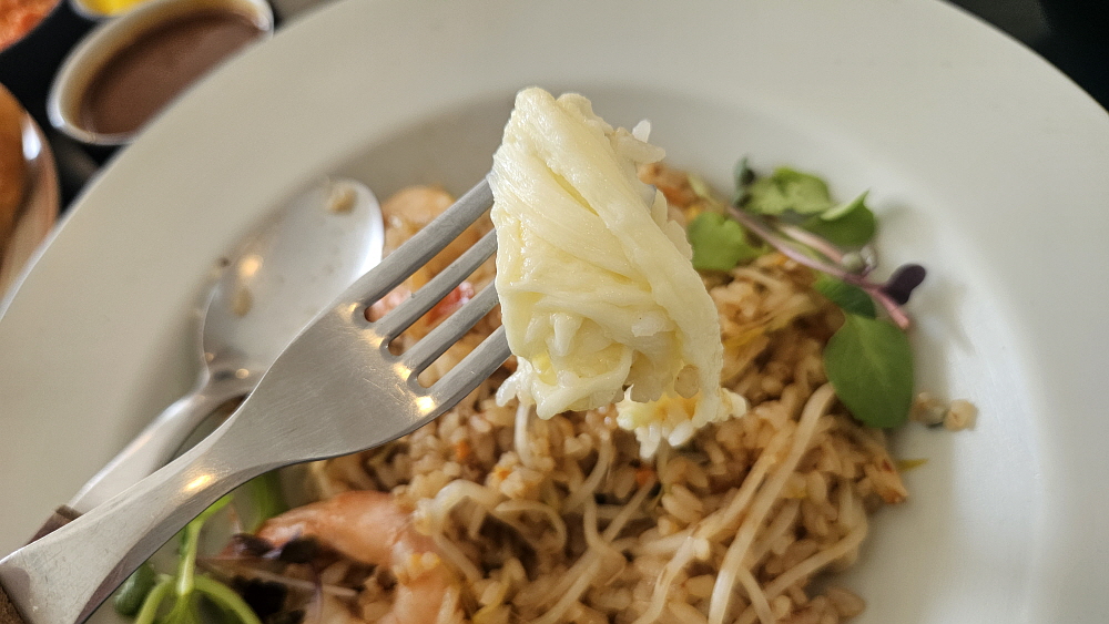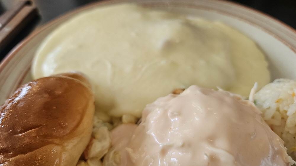 치즈 왕창 돈가스는 말 그대로 치즈가 너무 많이 나와서 밑에 깔린 돈가스가 보이지 않을 정도의 메뉴였다. 치즈가 비싸지 않던가? 어떻게 이렇게 많은 양의 치즈를 올려 놓았지? 의아한 생각이 들 정도로 많은 양의 치즈가 덮혀 있었다. 치즈를 들춰 내고 먹는 돈가스의 매력이 쏠쏠했다. 치즈가 너무 많이 나와서인지 돈가스의 두께는 시그니쳐 돈가스보다 얇은 편이었다. 얇은 고기를 치즈에 싸 먹으라는 뜻인가 보다. 정말이지 치즈를 고기에 싸서 먹어도 될 정도의 엄청난 양이었다. 여기도 마찬가지로 약간의 볶음밥과 빵 한 개가 함께 나온다.
