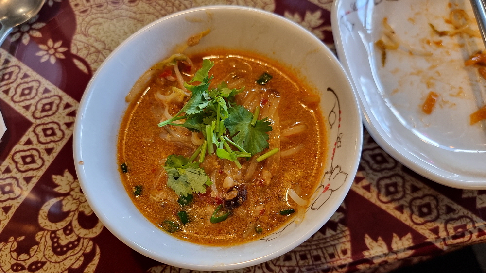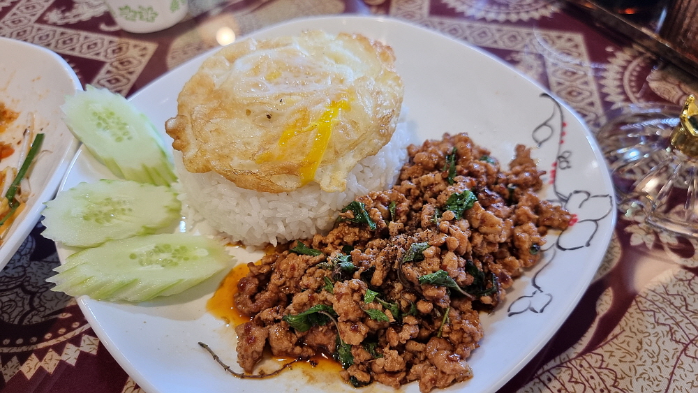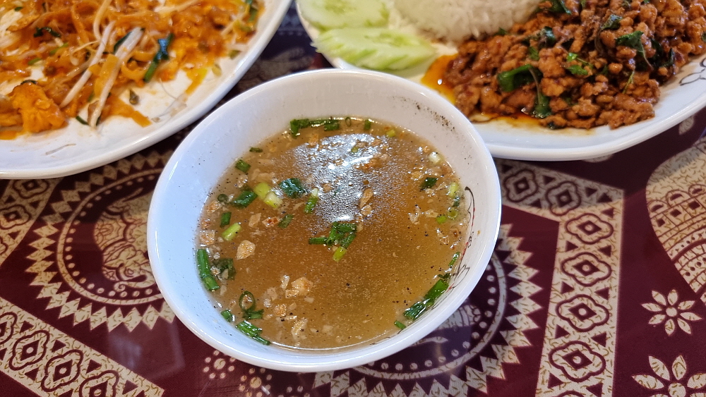 태국음식의 또 다른 대명사인 똠양꿍 비슷한 음식에 다른 뭔가가 들어간 국물요리가 나왔고, 소고기 덮밥처럼 생긴 밥도 나왔다. 조금씩 먹어보니 자연스럽게 '태국 맞네!' 싶은 생각이 들었다. 싫어하는 사람도 있겠지만, 태국 국물요리에는 의례 고수를 넣어 먹는 것이 더 맛의 조화가 좋단다. 고수를 절대 먹지 않겠다는 일행이 있어 조금씩만 넣어서 먹었다. 개인적으로 고수를 아주 즐기는 편은 아니지만, 그래도 이런 본고장의 음식에 필요하다면 넣어 먹기도 한다. 볶음밥 비슷한 소고기 덮밥이 우리 입에는 잘 맞았다. 이런 음식은 솔직히 나라를 떠나 누구라도 좋아할 음식이긴 하다.