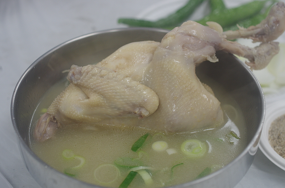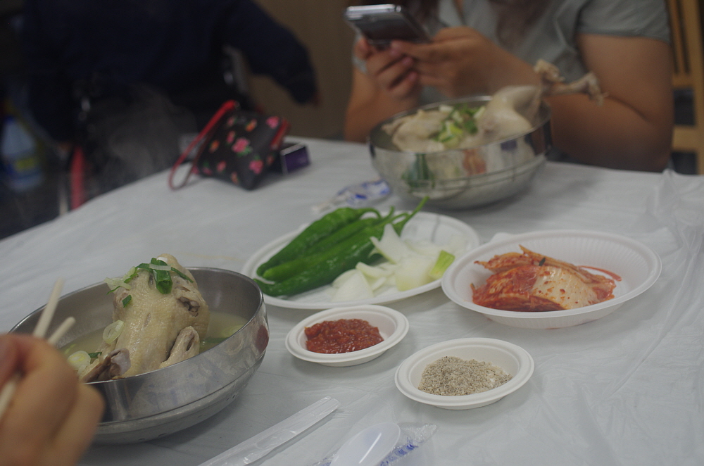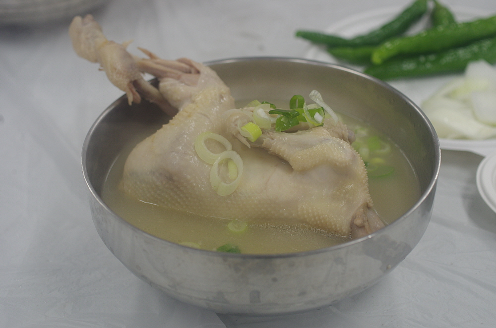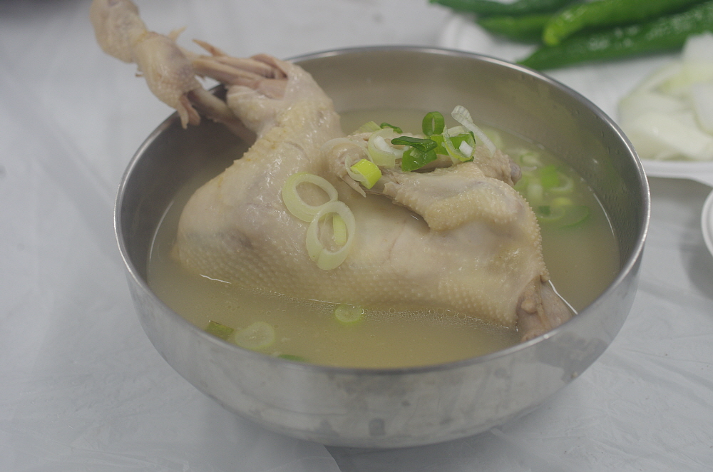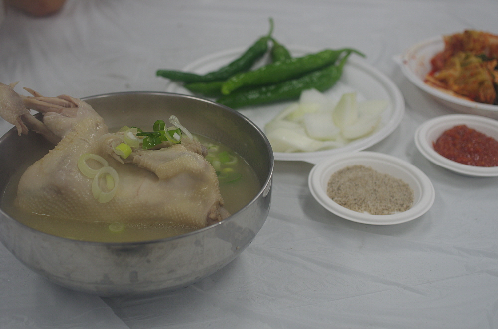 그런데 나온 닭고기를 보니 삼계탕이 아니라 닭백숙이었다. 보통 삼계탕은 인삼과 찰쌀을 닭 속에 넣고 끓여야 하는데 아마 사람도 많고, 손이 많이 가다보니 이렇게 그냥 닭만 끓인 모양이다. 그래도 작지 않은 닭 크기에 담백한 닭국물이 잘 어울리는 맛난 닭백숙이었다. 사실 삼계탕이 복날에 먹는 보양식이라고는 하지만 워낙 작은 닭을 사용하기 때문에 먹을 것은 별로 없다. 차라리 이렇게 덩치가 좀 있는 닭을 사용하여 고기도 먹고 국물도 먹고 나중에 밥도 말아 먹는 편이 더 현명한 일이지 모른다.