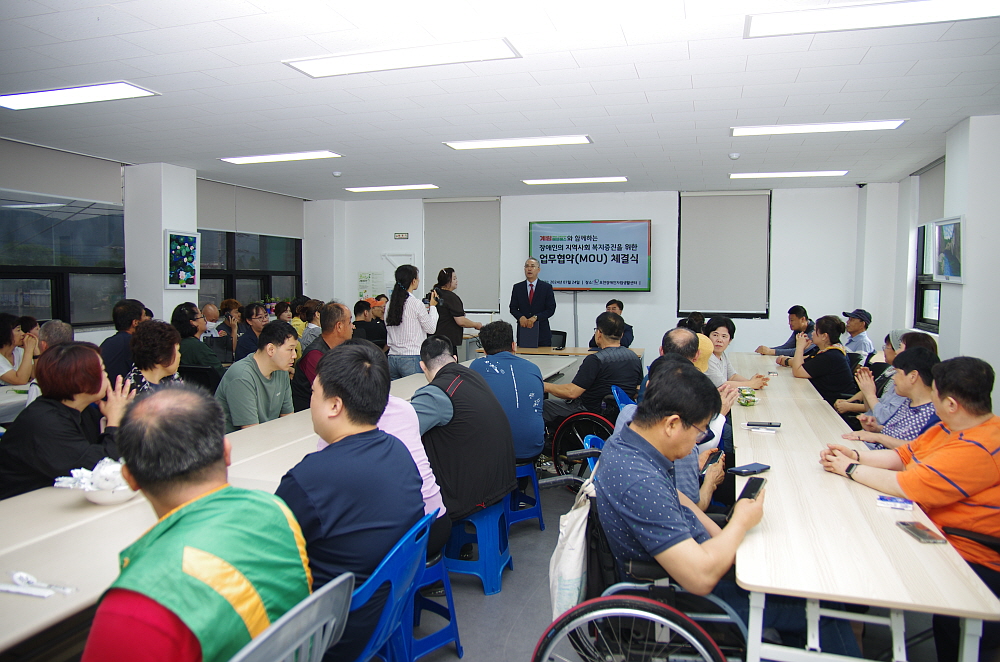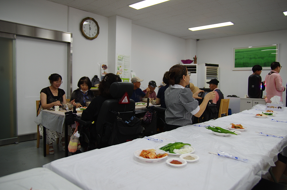 포천IL센터 내에는 직원과 장애인 회원들을 위한 구내 식당이 있다. 한 번에 약 30명 정도 식사를 할 수 있는 공간이지만 이날처럼 한꺼번에 사람들이 몰리면 식당 뿐 아니라 3층 교육장도 식당으로 사용해야 한다. 그러니 직원들의 음식 나르는 동선은 더욱 길어진다. 닭만 후원한 것이 아니라 김치와 자원봉사 밴드까지 함께 찾아와 사람들이 닭을 먹는 동안 흥을 돋게 해 주었다. 마치 시골 잔치집에서 밥을 먹는 기분이 들었다. 그런데 사람들이 많이 있다 보니 아무리 에어컨을 돌려도 쉽게 온도가 내려가지는 않았다. 조금은 덥고, 조금은 불편해도 이런 날 불평을 하는 사람은 없을 것이다.