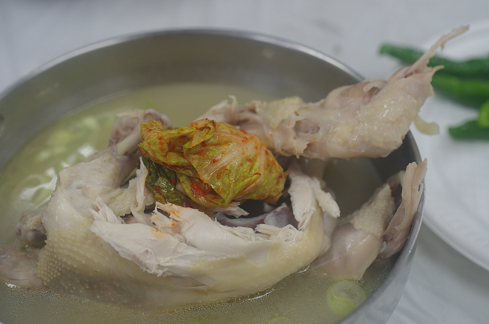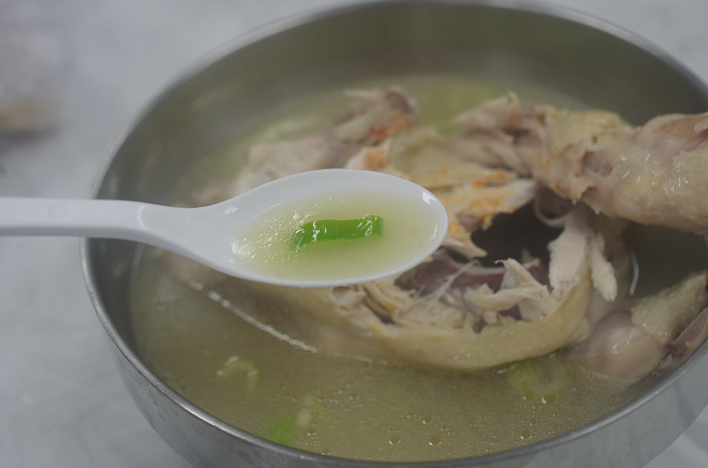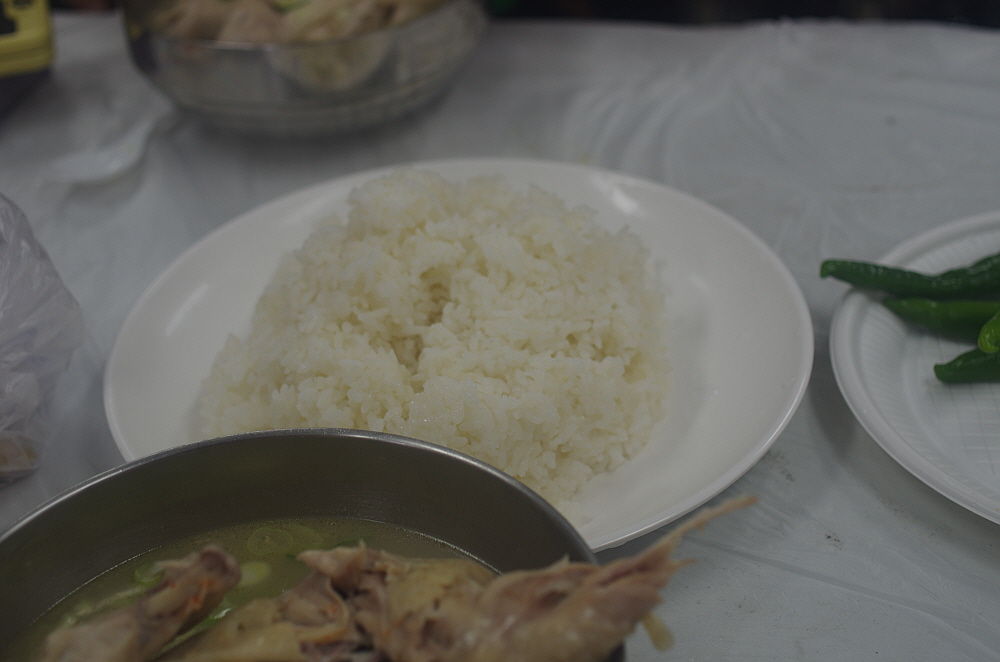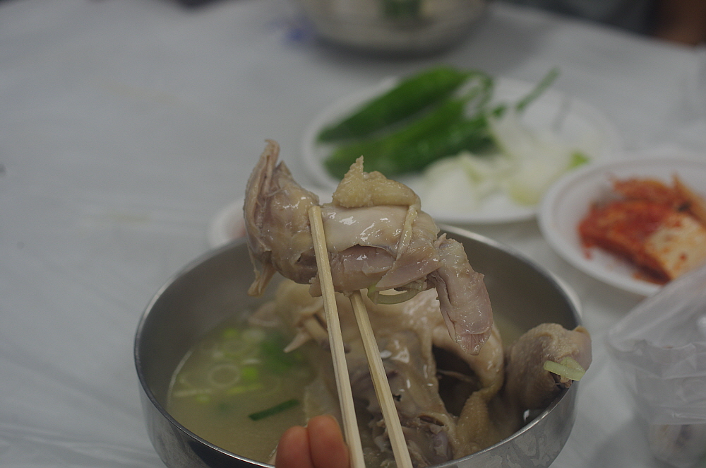 그런데 나온 닭고기를 보니 삼계탕이 아니라 닭백숙이었다. 보통 삼계탕은 인삼과 찰쌀을 닭 속에 넣고 끓여야 하는데 아마 사람도 많고, 손이 많이 가다보니 이렇게 그냥 닭만 끓인 모양이다. 그래도 작지 않은 닭 크기에 담백한 닭국물이 잘 어울리는 맛난 닭백숙이었다. 사실 삼계탕이 복날에 먹는 보양식이라고는 하지만 워낙 작은 닭을 사용하기 때문에 먹을 것은 별로 없다. 차라리 이렇게 덩치가 좀 있는 닭을 사용하여 고기도 먹고 국물도 먹고 나중에 밥도 말아 먹는 편이 더 현명한 일이지 모른다.