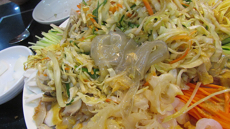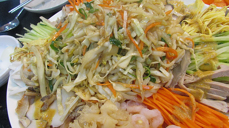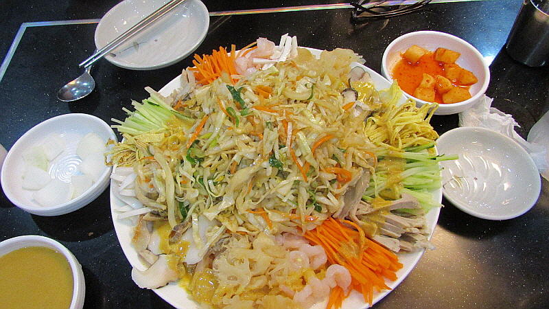 제대로 된 중국집을 만나면 꼭 먹고 싶었던 것이 있는데 바로 양장피였다. 어릴적 가끔 먹던 양장피는 어른들의 전유물 처럼 보였다. 두 장의 고구마 전분 같은 것으로 익힌 반 투명한 반죽을 넣은 것이 양장피라고 알고 있는데 중국요리 중에 그래도 덜 볶는 음식으로 기름기가 싫은 나같은 사람들도 좋아하는 메뉴가 바로 이것이다. 보통 비싼 가격에 비해 먹을 것이 없다는 푸념을 듣게 되는 음식이 양장피인데 이집은 25,000원 가격의 '소'자를 주문했는데도 도저히 보고도 믿기지 않을 정도로 양이 어마막시하게 많았다. 결국 거의 절반은 남기게 되어 포장을 해 달라고 했을 정도로 양이 많았다. 그리고 보니 이집은 결코 비싼 집이 아니었다. 거기에 강겨자를 넣은 양장피는 그대로 고량주를 부를 정도로 맛이 좋았다.