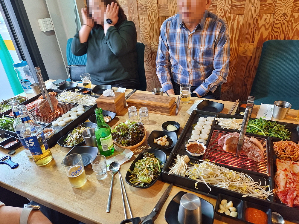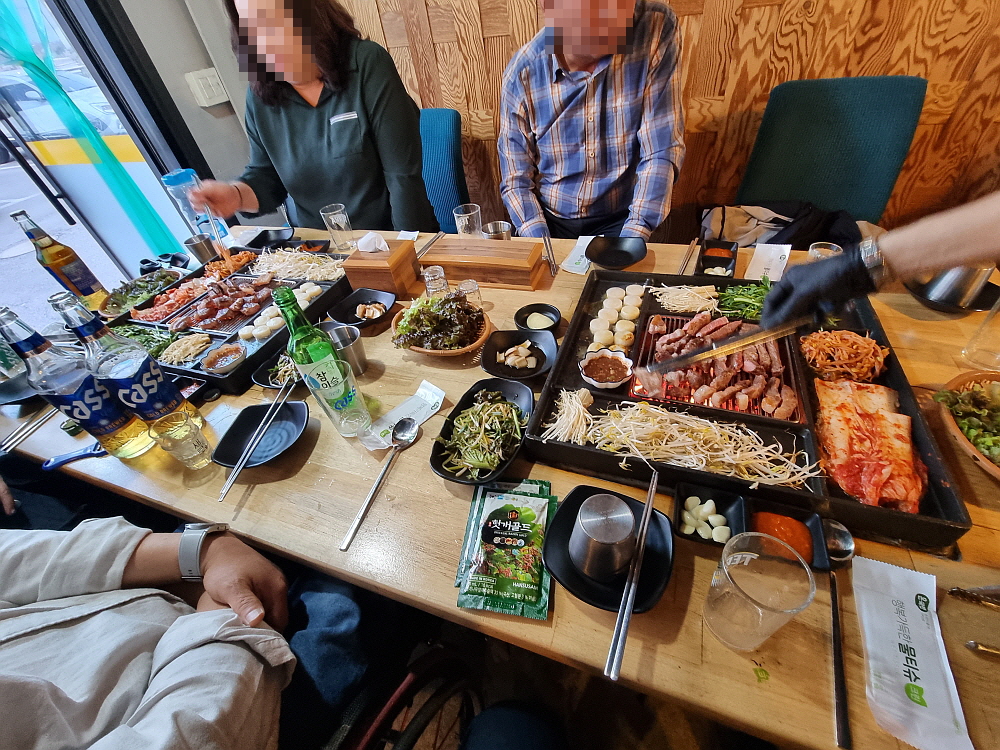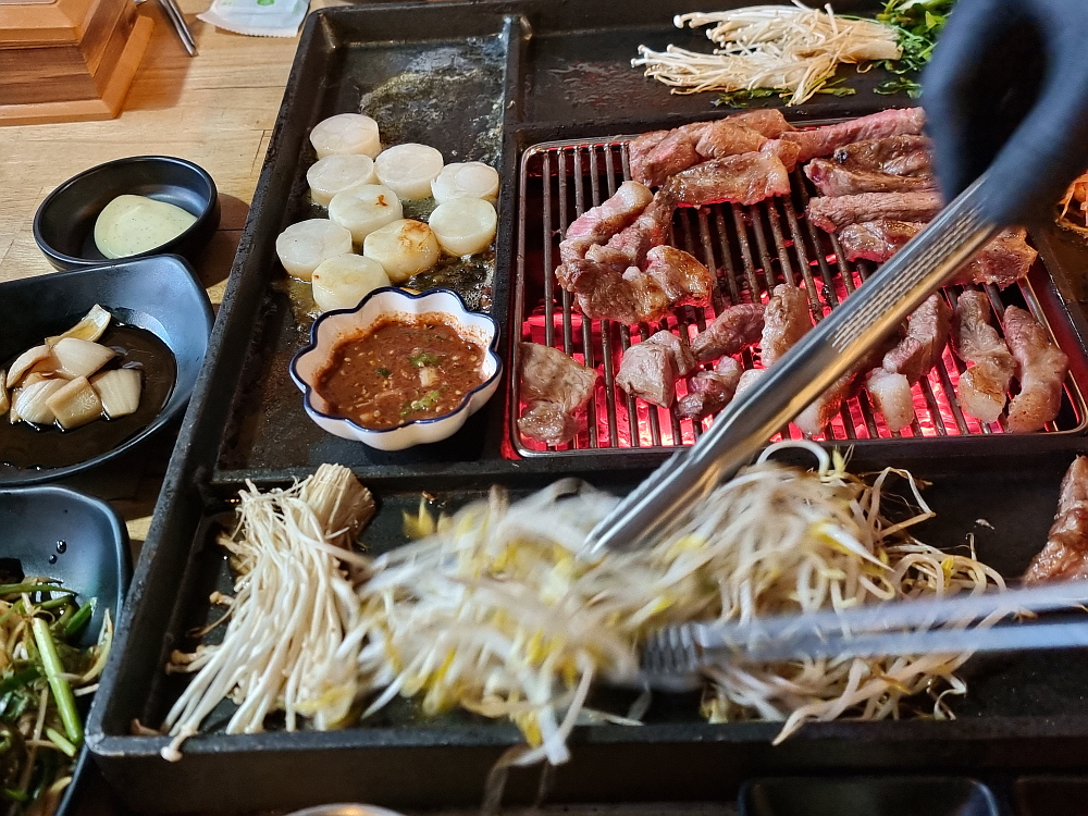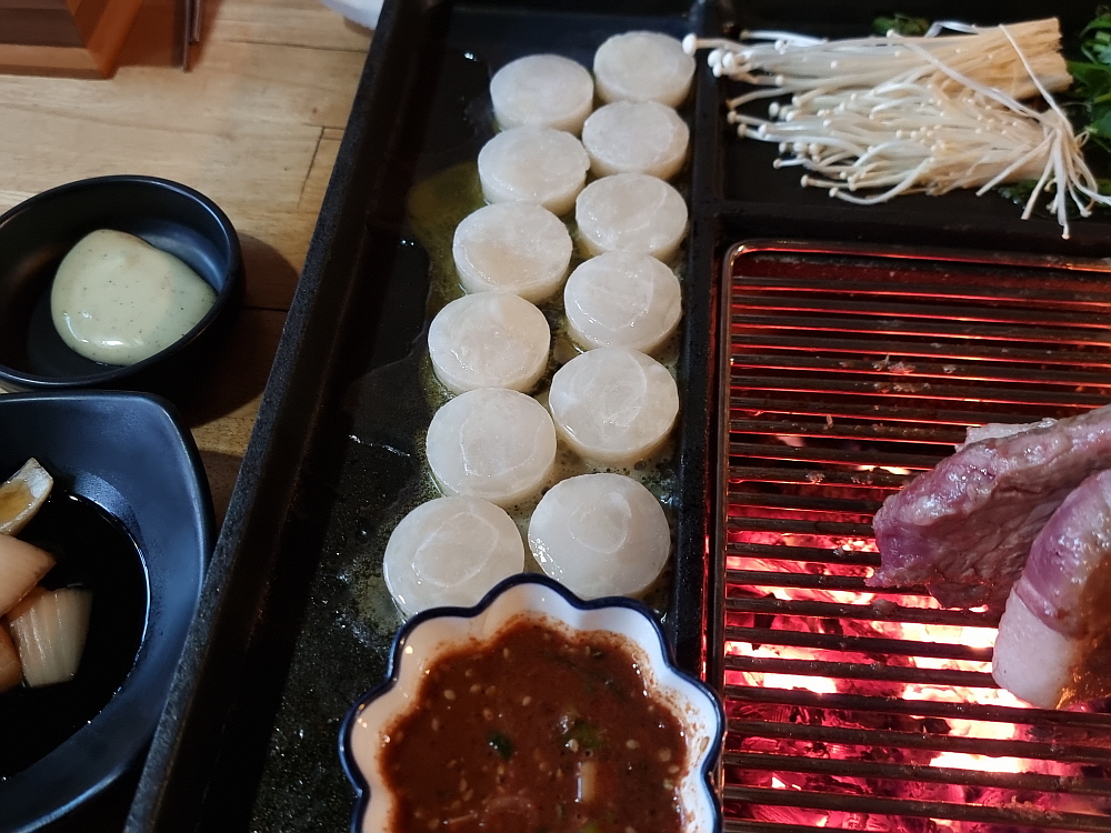 일단 바닥이 좀 높게 되어 있던 것이 평평하게 바뀌면서 훨씬 편하고, 안정감이 있어 보였다. 그리고 장작으로 직접 굽는 방식의 테이블 겸 불판도 다시 고안을 했는지 뭔가 다른 모양으로 바뀌어 있었다. 이런 방식의 굽는 테이블은 다른 곳에선 보기 힘든 것이다. 그 테이블 위에 커다란 불판을 놓고 거기에 고기며 김치, 조개관자까지 다 한꺼번에 구워 먹는 것이다. 예전엔 소고기도 있었던 것 같은데 이젠 돼지고기만 팔고 있는 것 같았다. 가리비관자살이 15,000원이라 하는데 양이 엄청 많아 관자 좋아하는 사람이라면 엄청 좋아할 만한 가성비였다.