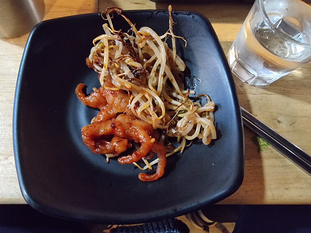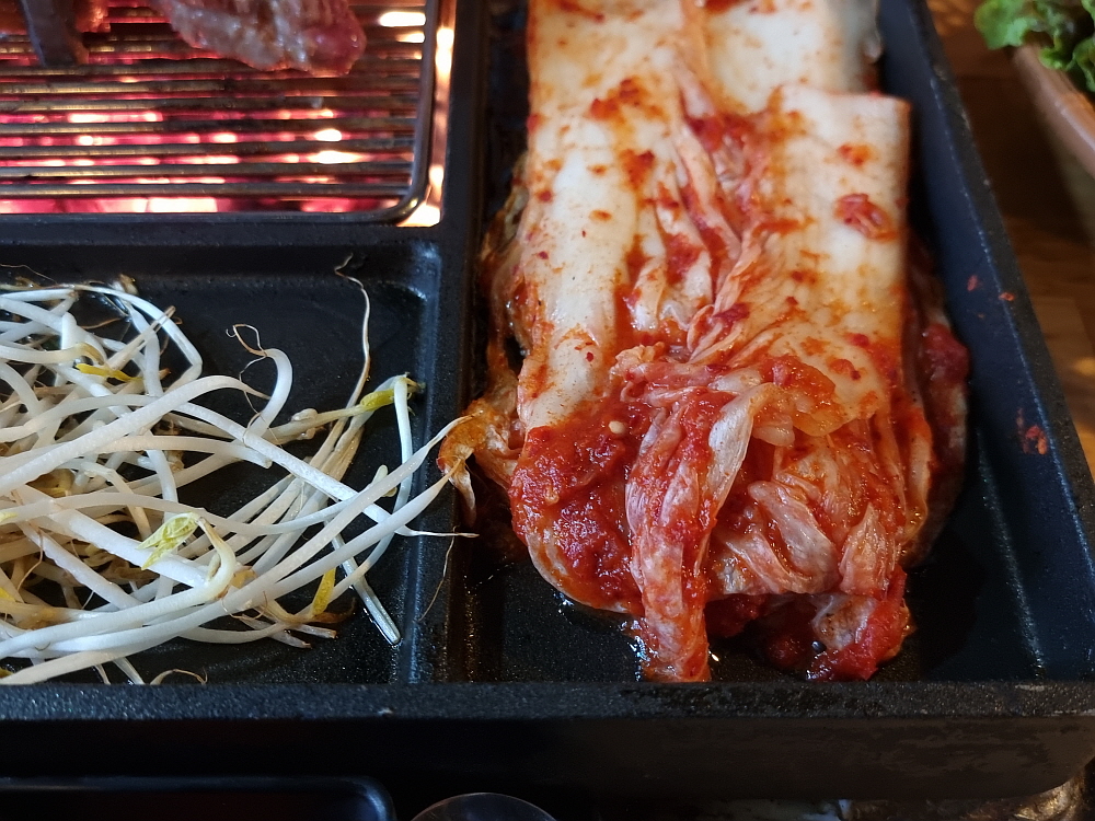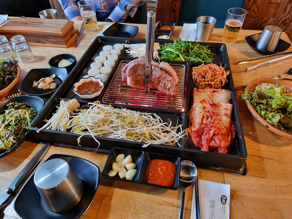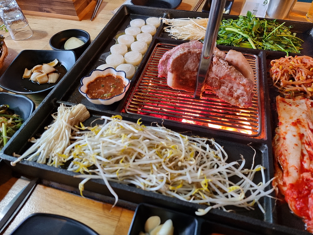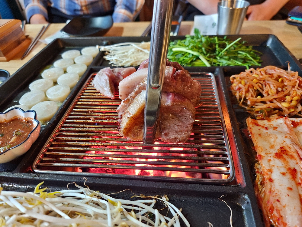 일단 바닥이 좀 높게 되어 있던 것이 평평하게 바뀌면서 훨씬 편하고, 안정감이 있어 보였다. 그리고 장작으로 직접 굽는 방식의 테이블 겸 불판도 다시 고안을 했는지 뭔가 다른 모양으로 바뀌어 있었다. 이런 방식의 굽는 테이블은 다른 곳에선 보기 힘든 것이다. 그 테이블 위에 커다란 불판을 놓고 거기에 고기며 김치, 조개관자까지 다 한꺼번에 구워 먹는 것이다. 예전엔 소고기도 있었던 것 같은데 이젠 돼지고기만 팔고 있는 것 같았다. 가리비관자살이 15,000원이라 하는데 양이 엄청 많아 관자 좋아하는 사람이라면 엄청 좋아할 만한 가성비였다.