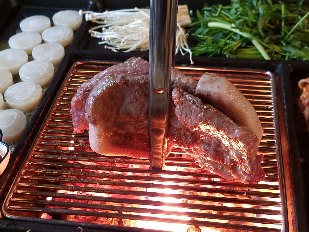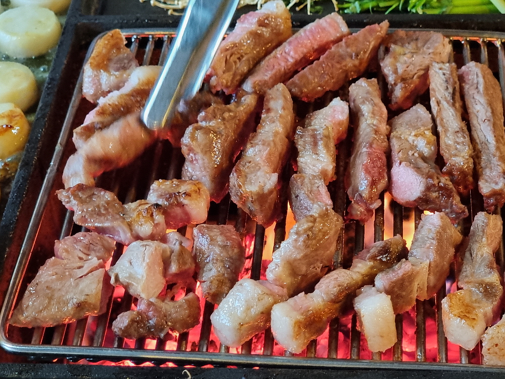두툼한 고기를 잘 익히기 위해 집게로 잡아서 세로로 굽기도 한다. 이렇게 굽는 모습도 본적이 없다. 뭐랄까 징기스칸 고기를 굽는 듯한 모습이라고 할까? 아무튼 직화의 가장 큰 단점인 고기가 쉽게 탈 수 있다는 점을 감안하면 여기는 종업원들이 수시로 다니며 고기를 적당히 익혀 주고 있다. 이렇게 세로로 굽는 것도 이집만의 노하우라고 하겠다. 어느 정도 고기가 익었다 싶으면 잘게 잘라 먹기 좋게 만들어 준다. 손님들은 손에 고기 냄새 밸 일도 없다. 이런 서비스를 생각하면 가성비가 좋은 편이라 하겠다.