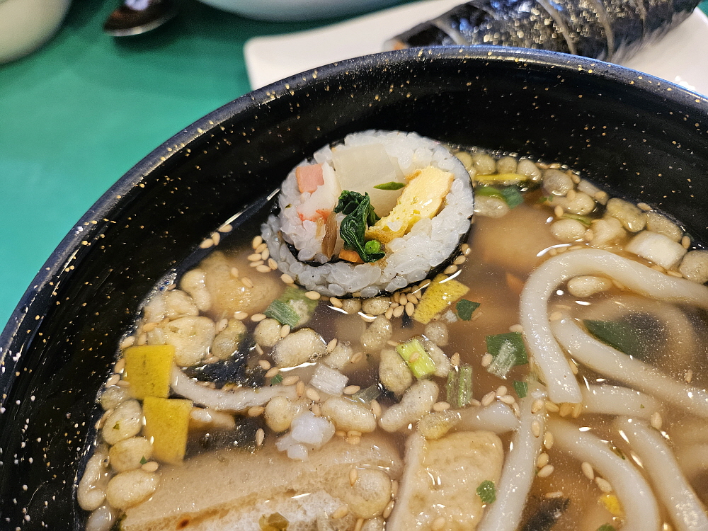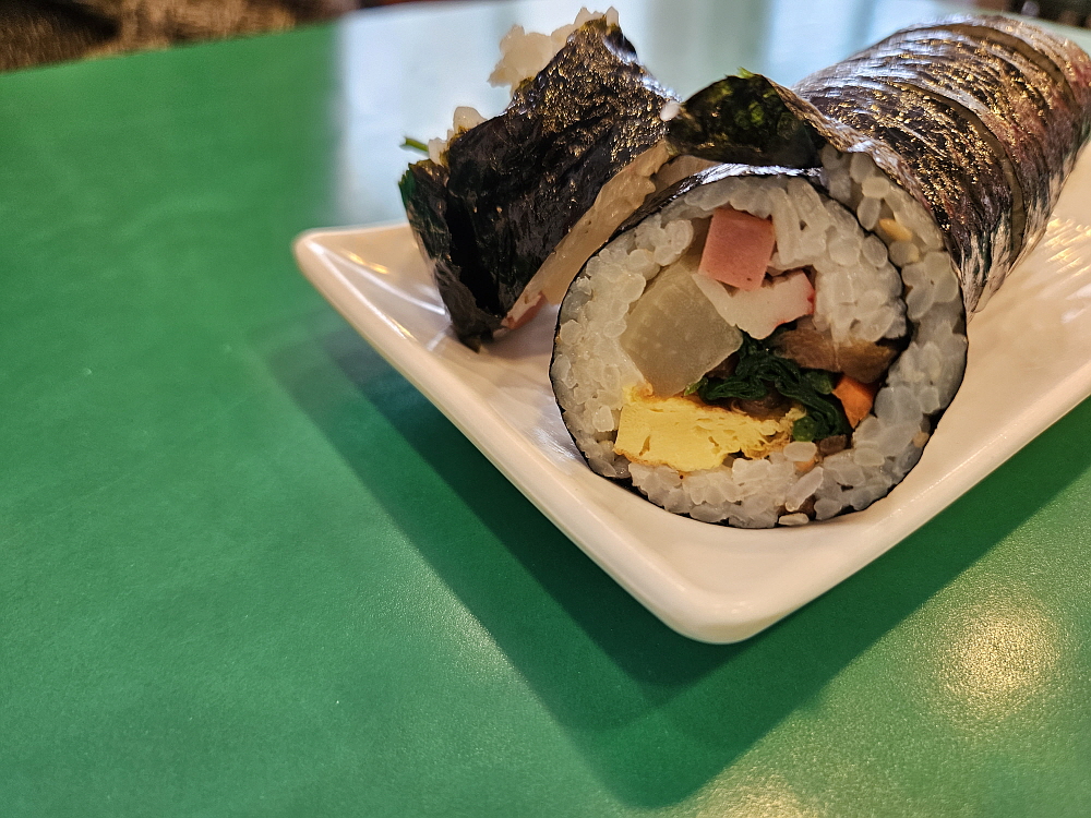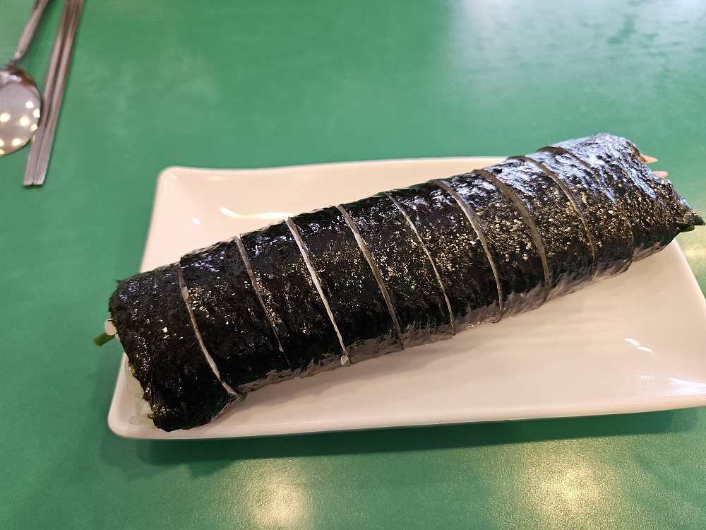 분식집의 가장 큰 강점은 역시 가격이 저렴하다는 것이다. 이집도 그랬다. 우리는 김밥과 우동, 그리고 치즈라볶이를 주문했는데 다 합쳐서 15,000원 밖에 안 된다. 갈비탕 한 그릇 가격이다. 저렴하지만 푸짐하게 먹을 수 있다. 토마토와 김밥이라는 상호에서처럼 여긴 주먹밥과 김밥이 주력인 분식집이다. 당연히 시그니쳐인 김밥을 먹어봐야 한다. 김밥이 제일 먼저 나왔는데 내용물을 보니 전형적인 김밥의 모양이었다. 적당량의 밥과 단무지와 햄과 맛살, 지단과 우엉, 당근과 요즘 보기 힘든 시금치도 있다. 너무나 익숙한 김밥의 비주얼이었다.