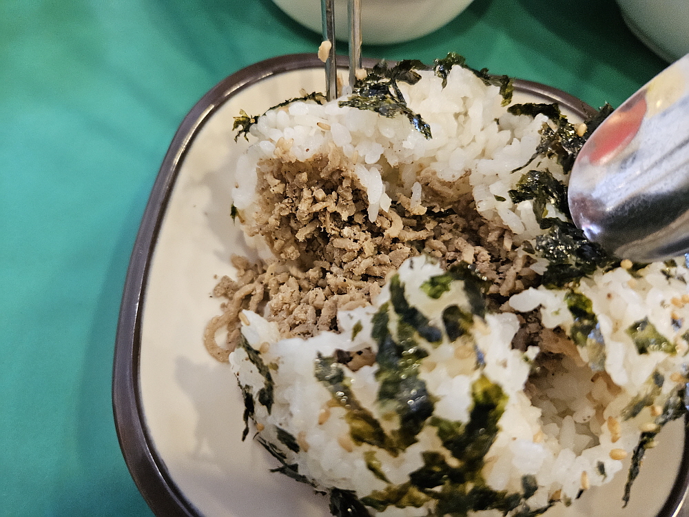 함께 간 일행이 뭔가 아쉽다면서 주먹밥도 주문했다. 여긴 원래 주먹밥이 더 유명한 곳이란다. 그런데 간단하게 하나 더 추가해서 먹으려던 우리 생각은 빗나갔다. 주먹밥이 커도 너무 컸기 때문이다. 그냥 밥 한 그릇이 온통 주먹밥으로 환생한 것 같다. 소고기 주먹밥을 주문했는데 밥 속에 소고기 후레이크가 들어 있고, 겉에는 김을 뭍혀주는 것이 이집의 방식이었다. 이것도 역시 학생들이라면 손에 들고 서너개는 먹을 것이다. 가만히 보니 여긴 학생들의 급식을 주는 집이라는 생각도 들었다. 학생시절을 계속 떠올리게 하는 이집에서의 한끼는 추억도 곱씹은 시간이었다.