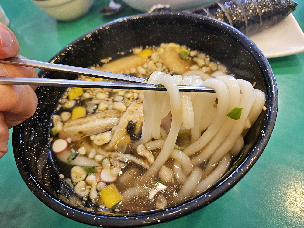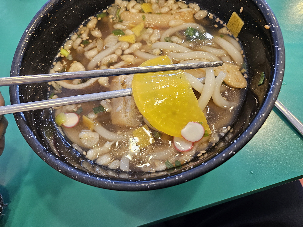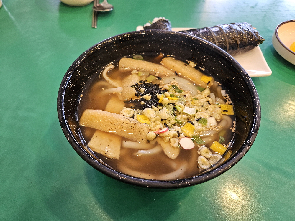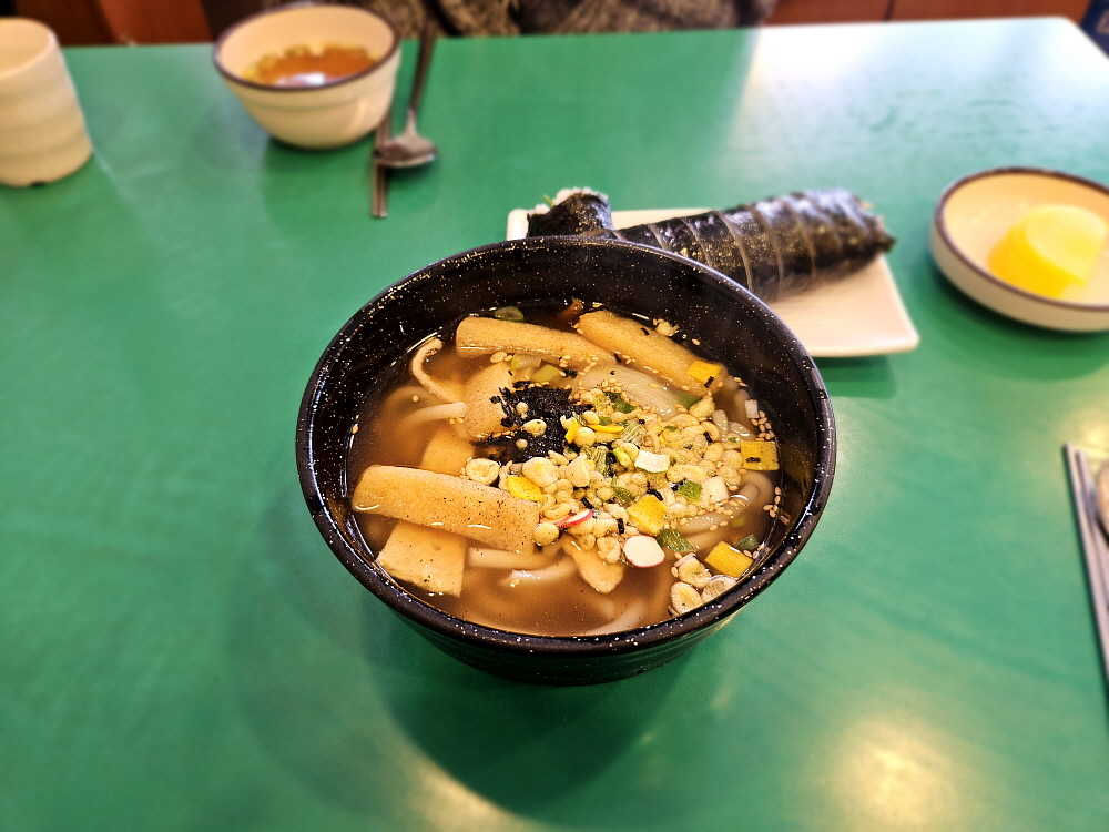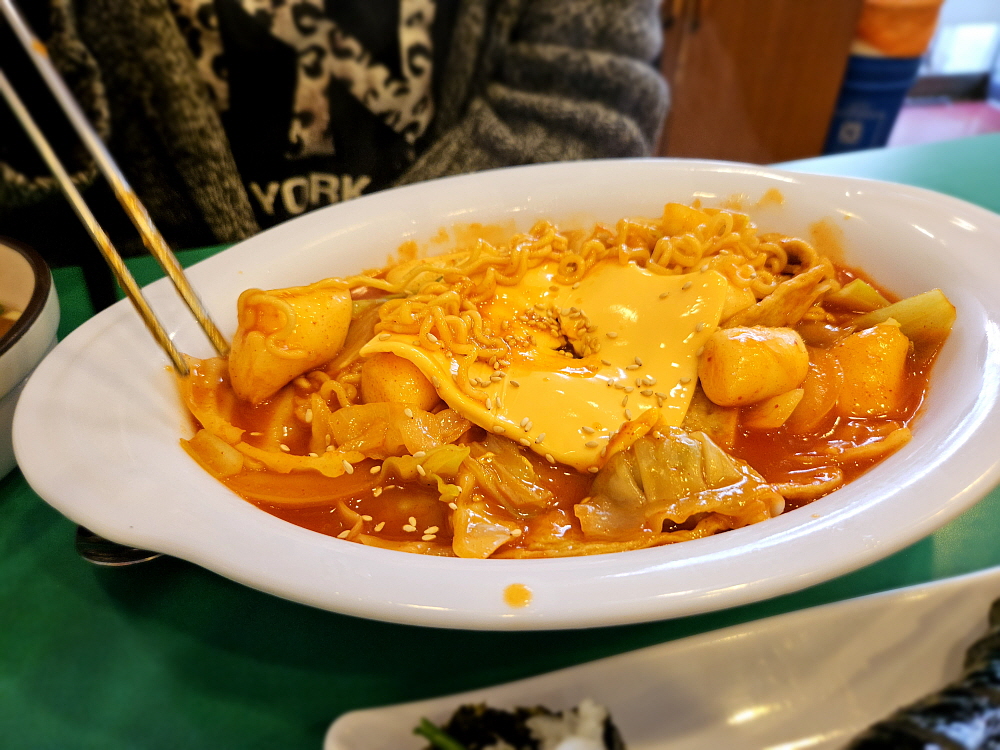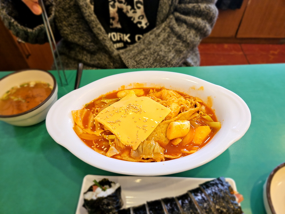 뒤이어 우동과 치즈라볶이도 나왔다. 우동은 흔히 고속도로 휴게소에서 보았던 바로 그 비주얼이었다. 그릇이나 담겨있는 모양이 정말 비슷했다. 신기한 것은 훨씬 푸짐해보이는 치즈라볶이의 가격이 더 저렴하다는 것이다. 보통 가장 싼 메뉴가 늘 우동인 것 같은데 말이다. 우동은 설명이 필요없는 너무나 익히 먹었던 그 맛이었다. 부드러운 면발과 가쓰오부시로 맛을 낸 것 같은 국물까지 전형적인 분식집의 맛이었다. 치즈라볶이도 결국은 라면이다. 라면을 떡볶이처럼 만든 것이 라볶이 아닌가... 거기에 치즈를 한 장 얹어주는 것이다. 모짜렐라 치즈를 생각했다면 그것과는 좀 다르다.