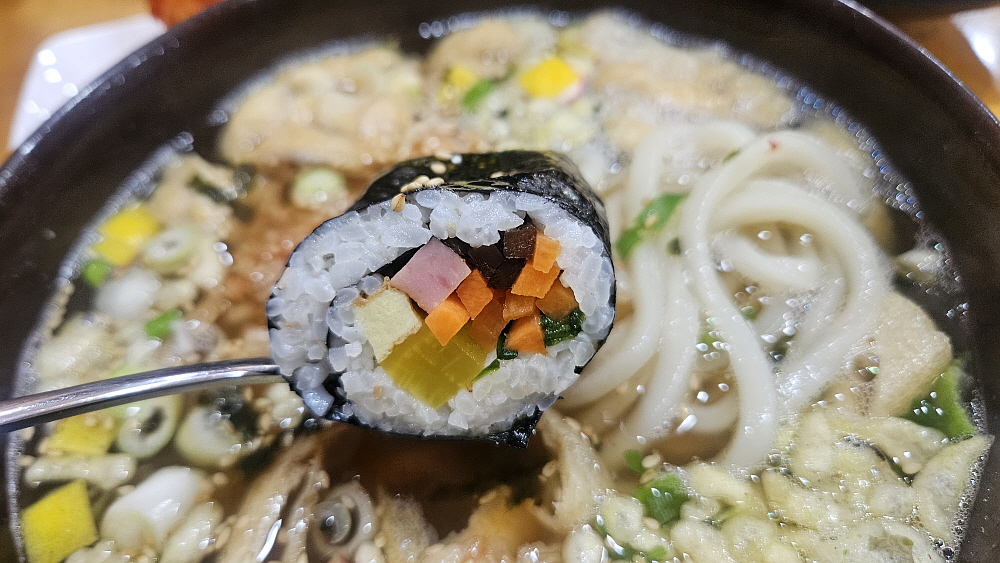 시그니쳐 김밥의 가격은 3,000원이다. 착한 편이다. 김밥이 한 줄 1,000원이라던 시절이 엊그제 같은데 이젠 5,000원짜리도 많다. 김밥이 비싸다고 훨씬 많이 좋은 것은 아니다. 오히려 시그니쳐 김밥이 더 입에 맞을 때가 있다. 한쪽에서 연신 말고 있는 김밥은 말 그대로 즉석김밥인 셈이다. 유뷰나 고명이 잔뜩 들어간 우동은 국물로서 위치를 굳건히 잡고 있었다. 흔한 맛이지만 이런 익숙함이 더 자연스럽고 만족스러울 수 있다. 분식집에 올 때마다 생각나는 것은 학교 다니던 시절의 추억이다. 오후 수업을 마치고 자습실로 가야 한다며 다들 학교 근처의 분식집으로 몰려들 갔었다.