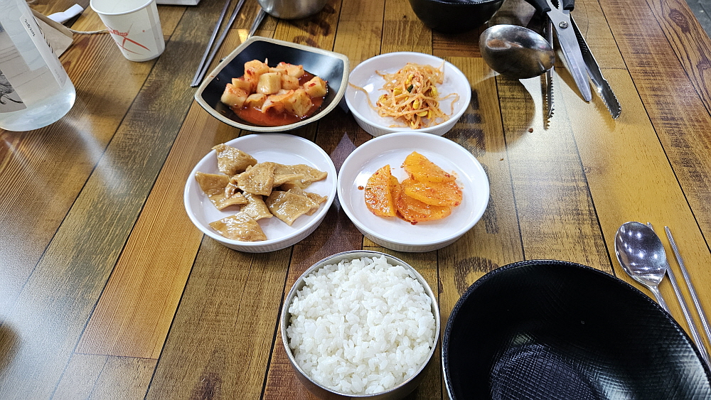 개인적으로 가장 좋아하는 반찬이자 외식 메뉴가 김치찌개이지만 집에서 늘 먹던 반찬인데 여기까지 와서 돈 주고 사먹기가 그렇다고 하는 사람도 있다. 뭐 메뉴야 자신이 좋아하는 것을 고르는 것이니 알아서 하는 것이다. 그래서 우리는 김치찌개와 청국장을 주문했다. 청국장도 너무나 익숙한 반찬이긴 하지만 그래도 김치찌개보다야 아무래도 덜 먹게 되는 아이템 아닌가... 그렇게 사이좋게 서로의 반찬을 나누어 먹기로 했다. 김치찌개를 1인분만 주문했는데도 냄비에 담겨 손님 테이블에서 끓여 먹는 방식이었다. 두툼한 돼지고기에 김장김치로 보이는 큼직한 김치들이 사이좋게 들어 있었다.