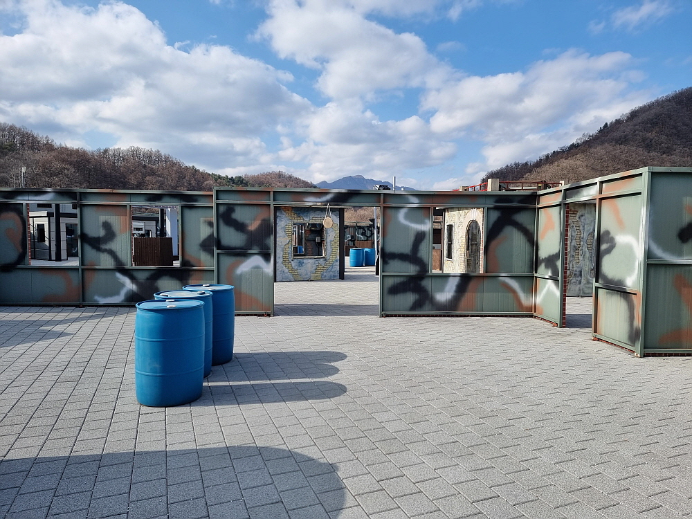 그런데 하늘다리 근처에 사람들이 잘 몰라서 그렇지 아주 좋은 놀이시설이 있다. 바로 서바이벌 경기장이다. 이 시설의 관계자 말로는 이런 정도의 규모와 설비는 단연 포천이 다른 지역보다 앞선다고 했다. 과연 그의 말대로 이번에 둘러 본 서바이벌 경기장은 무척 인상적이었다. 우선 크기가 다른 지역의 서바이벌 경기장을 압도했다. 고양시의 그것과 비교하여 두 배는 더 크다는 말이 실감 났다. 시설도 비교적 새것이라 마치 영화 세트장을 보는 것 같았다.