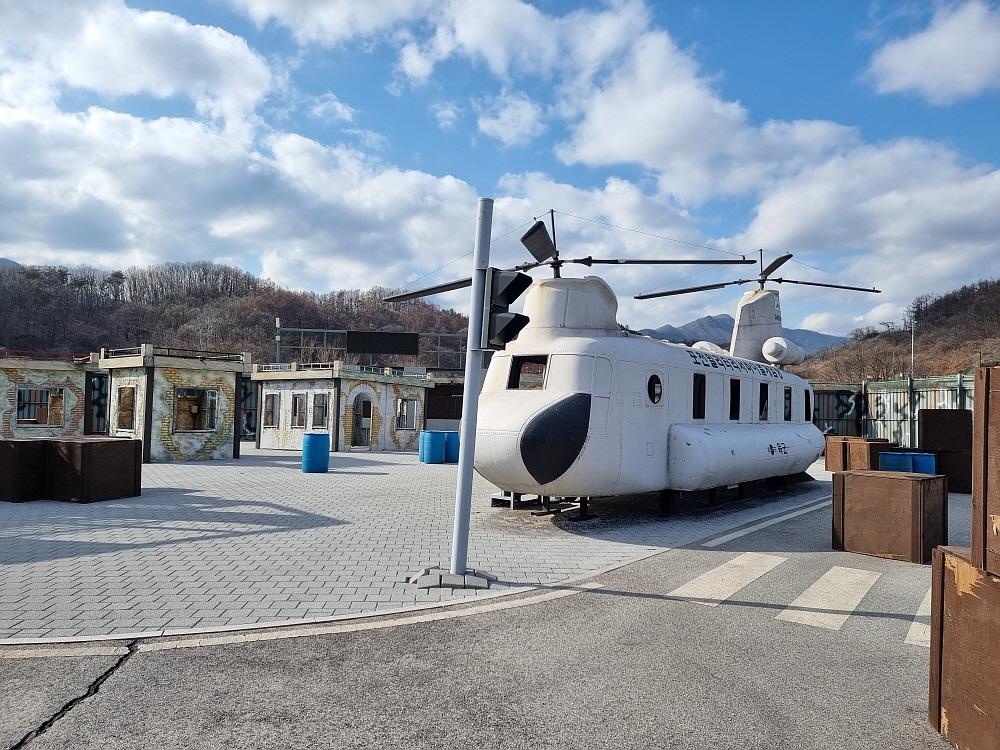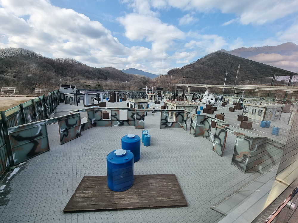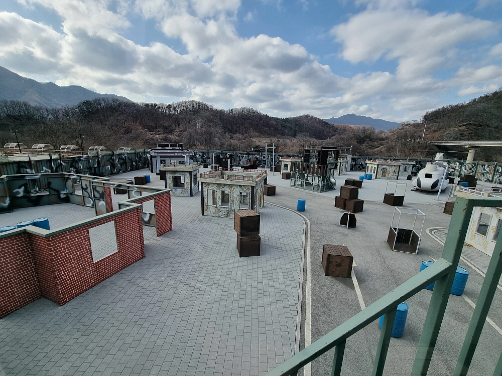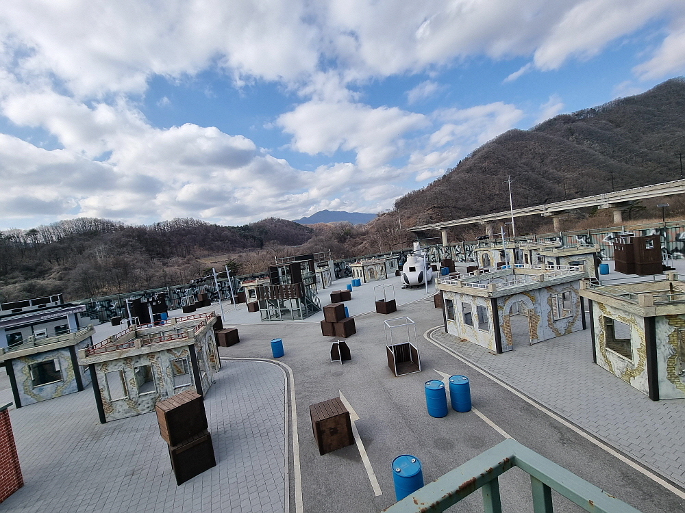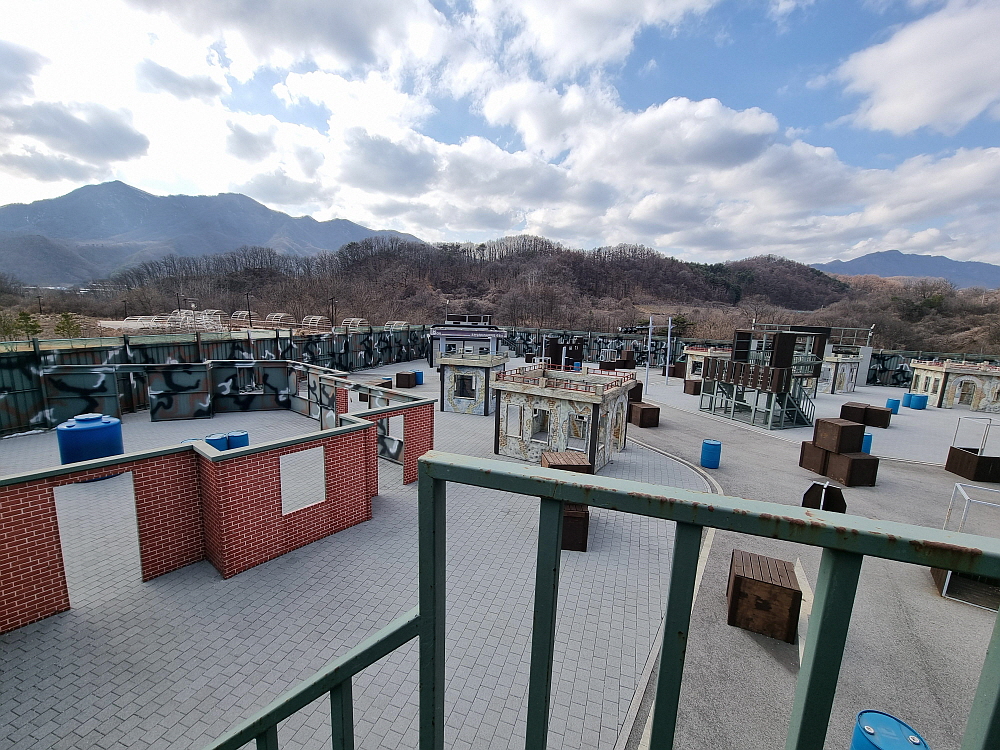 그런데 하늘다리 근처에 사람들이 잘 몰라서 그렇지 아주 좋은 놀이시설이 있다. 바로 서바이벌 경기장이다. 이 시설의 관계자 말로는 이런 정도의 규모와 설비는 단연 포천이 다른 지역보다 앞선다고 했다. 과연 그의 말대로 이번에 둘러 본 서바이벌 경기장은 무척 인상적이었다. 우선 크기가 다른 지역의 서바이벌 경기장을 압도했다. 고양시의 그것과 비교하여 두 배는 더 크다는 말이 실감 났다. 시설도 비교적 새것이라 마치 영화 세트장을 보는 것 같았다.