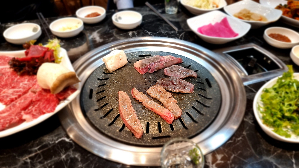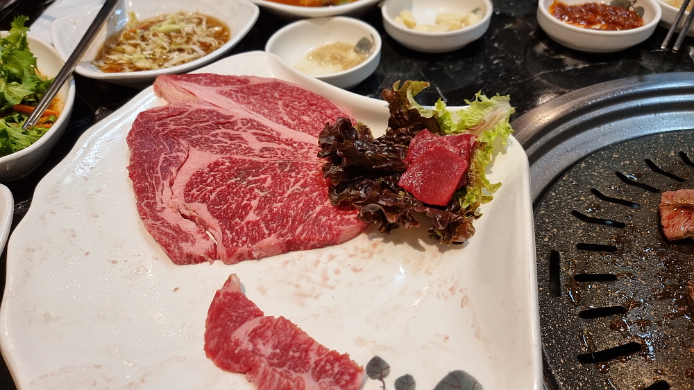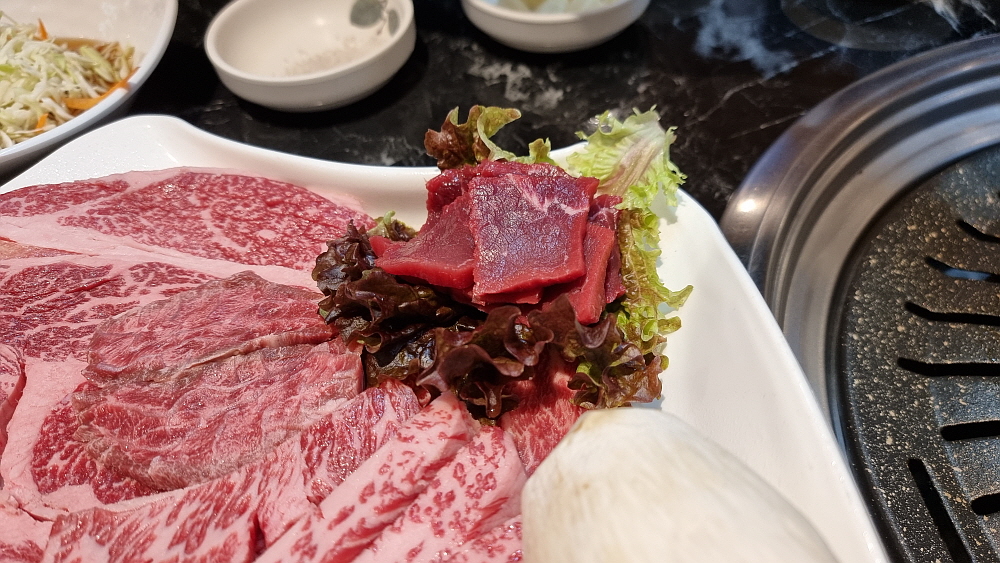 우리 일행은 모두 네 명이었다. 적당한 양인지 모르겠지만 우리는 여기서 가장 비싼 특수모듬을 주문했다. 안심과 같은 98,000원이라는 꽤 센 가격이다. 물론 양은 많은 편이다. 이렇게 주문하면 600g, 즉 한 근이 나온다. 한우를 제대로 먹을 줄 아는 사람들은 보기만 해도 등급이 나온다고 하던데 워낙 소고기에 문외한인지라 그냥 선홍색의 고기가 좋아 보였다. 아주 신선해 보이는 제대로 된 소고기였다. 이러니 값이 많이 나가지... 좋은 등급의 소고기는 다른 양념도 필요없고, 오래 구울 필요도 없다고 했다. 이날이 그런 날이었다.