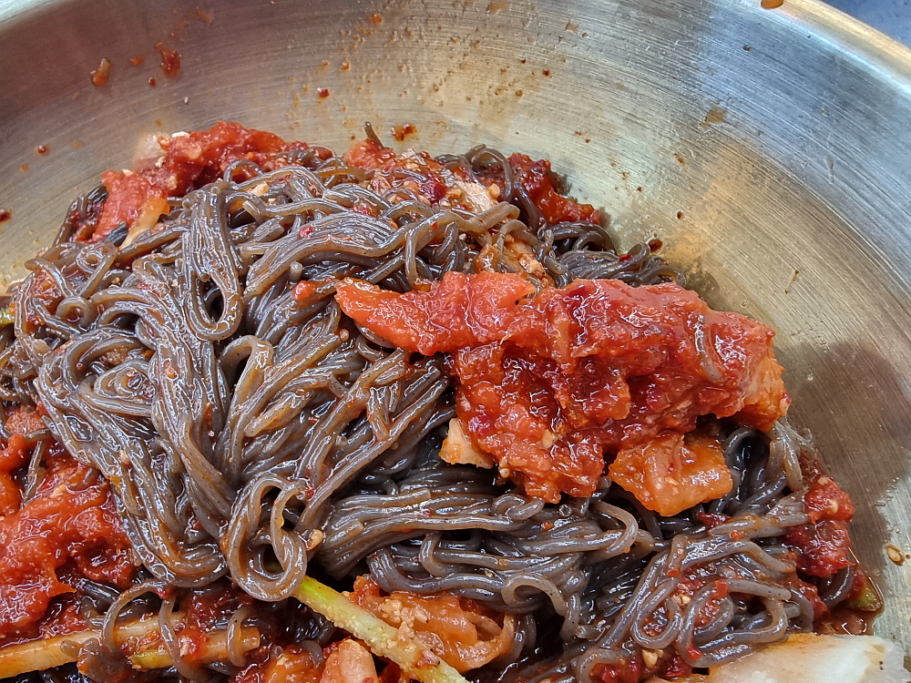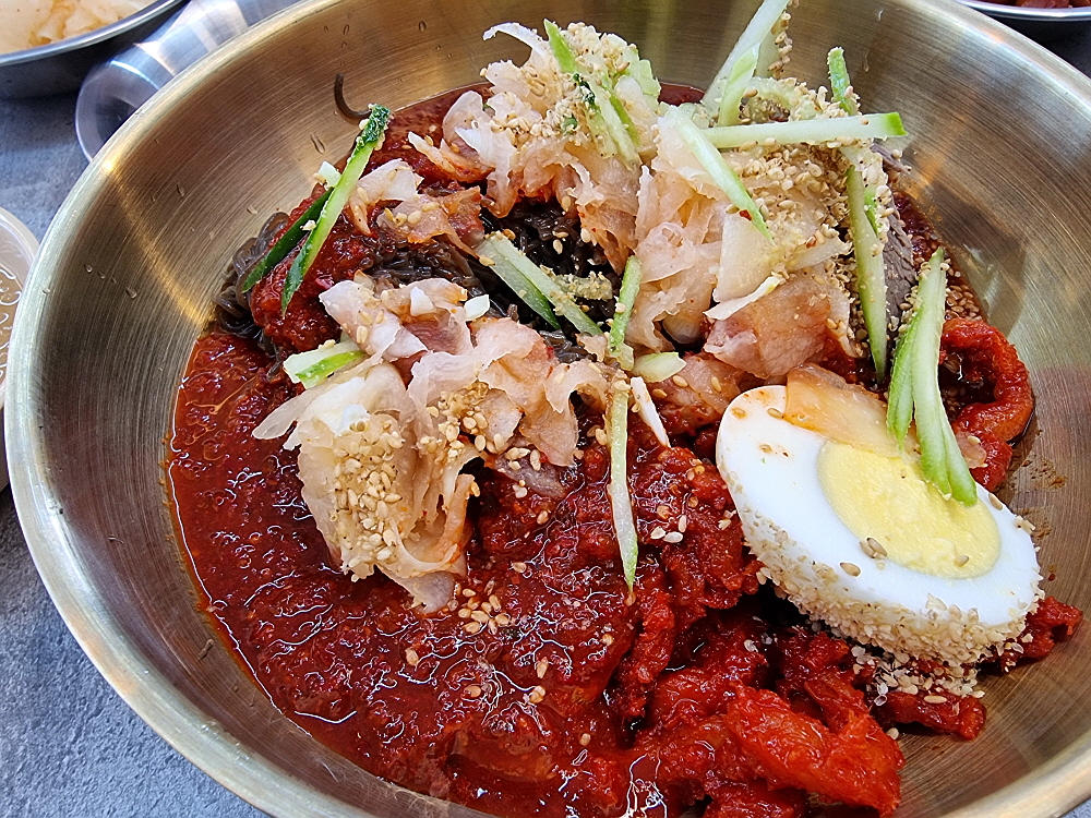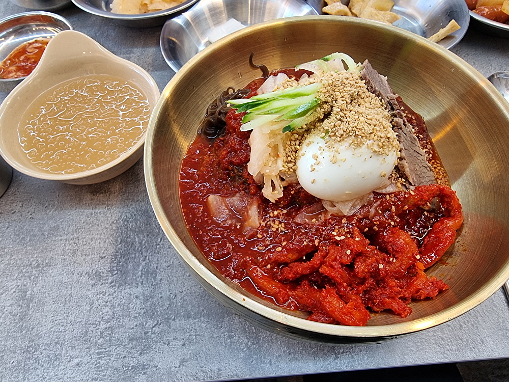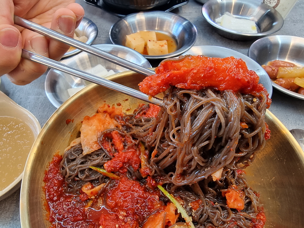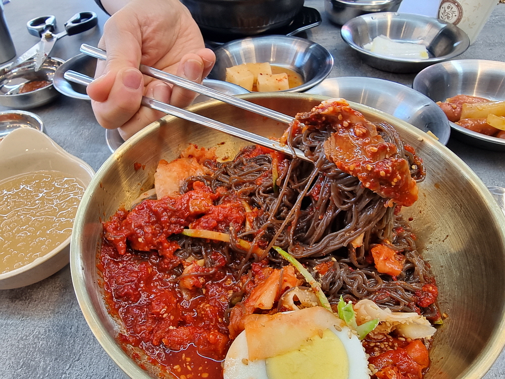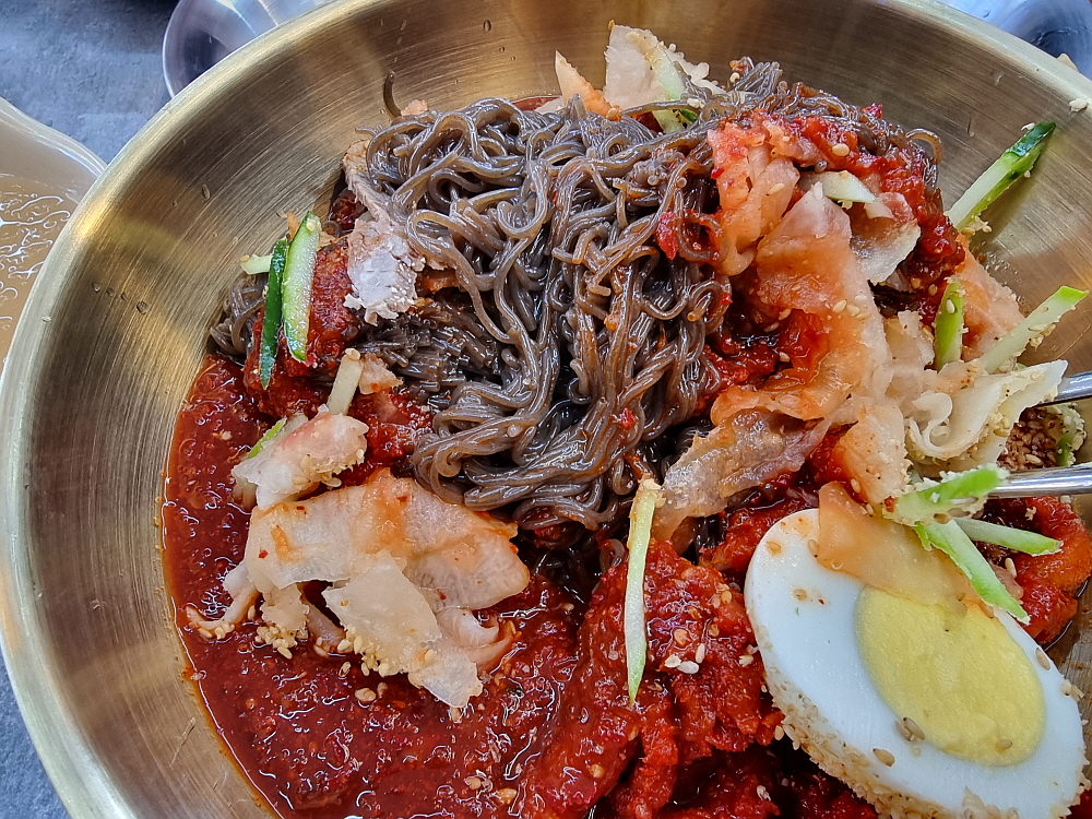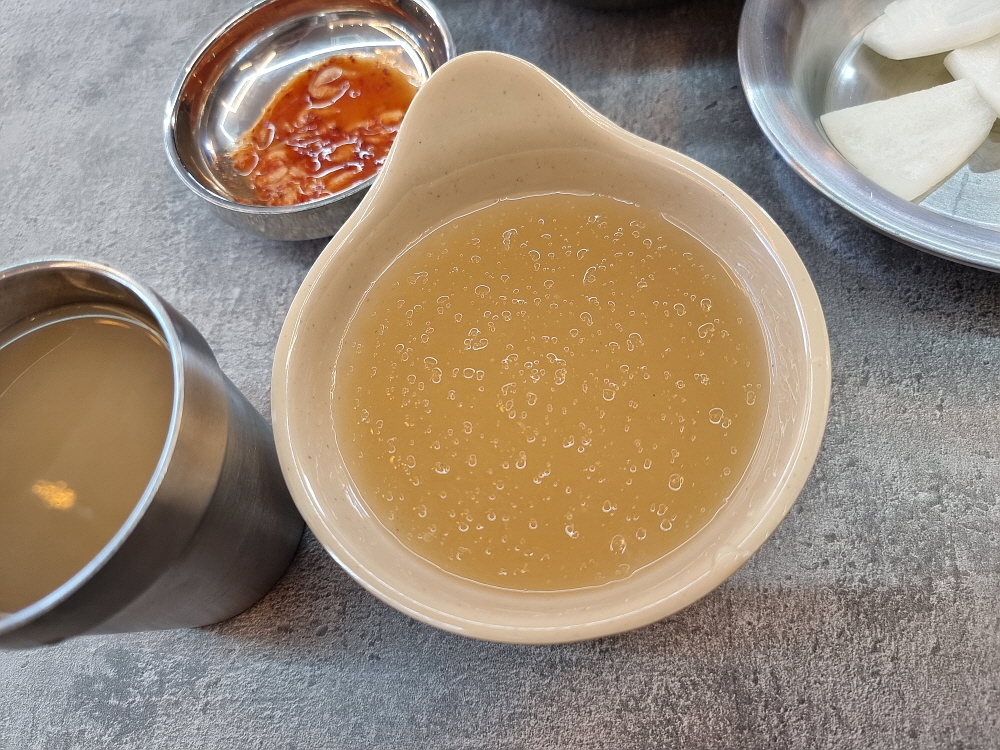만일 송우리 먹자골목에 있던 집이 이리로 옮겨 온 것이라면 냉면은 칡냉면이 맞을 것이다. 먹자골목에서 그집의 상호가 유성칡냉면이었기 때문이다. 그런데 냉면을 받아 보니 그런 생각이 얼추 맞는 것 같았다. 칡냉면 특유의 약간은 검은빛이 도는 면이 그런 특징을 말해주고 있기 때문이다. 칡냉면은 메밀냉면과는 또 다른 세계다. 메밀을 주 원료로 하는 전통적인 냉면보다 더 시큼하고, 달달한 양념이 특징이라면 특징일 것이다. 거기에 시원하고 시큼한 육수 한 사발을 주는 것도 칡냉면의 묘미라 할 수 있다. 여기도 그런 구성이 비슷했다.