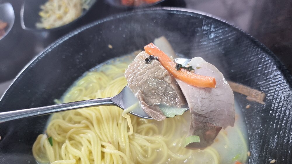 매서운 동해안의 겨울 바람이 주인인양 행세하는 아침에 아직 열이 나지 않는 가게에 들어가 앉아 있는 일은 곤욕이긴 했다. 하지만 뜨건 국물을 먹다보면 금새 몸에서 열이 날 예정이기에 조금은 쌀쌀한 기운을 그대로 맞으며 앉아서 기다렸다. 유난히 사진에 김이 많이 서린 채 찍힌 것은 이런 아침의 컨디션 때문이다. 10분 정도 기다리니 드디어 우리의 고기국수가 나왔다. 그냥 봐도 전형적인 제주 고기국수와 아주 흡사했다. 일본의 돈코츠 라멘과도 아주 닮았다. 역시 이들은 조상 대에서 뭔가 일이 있었을게다. 이렇게 비슷할 수가 없다. 너무 맛나 보이는 국물을 그냥 열 숟가락은 떠 먹은 듯 하다.