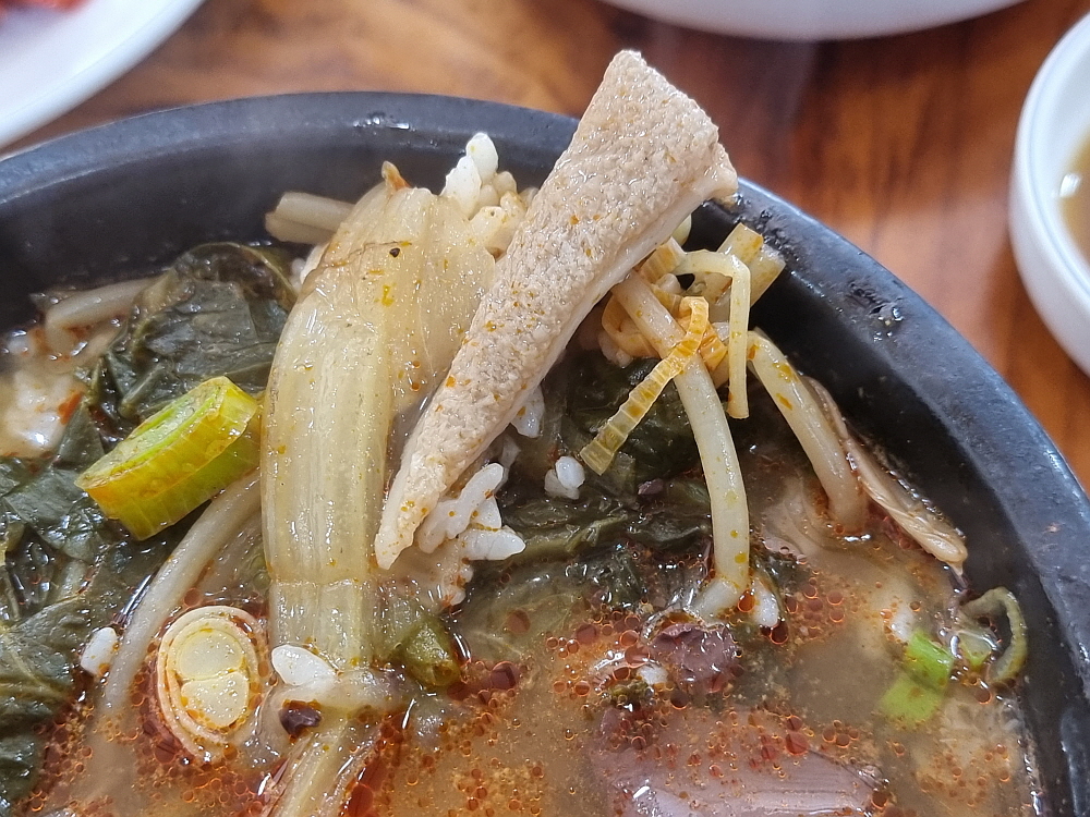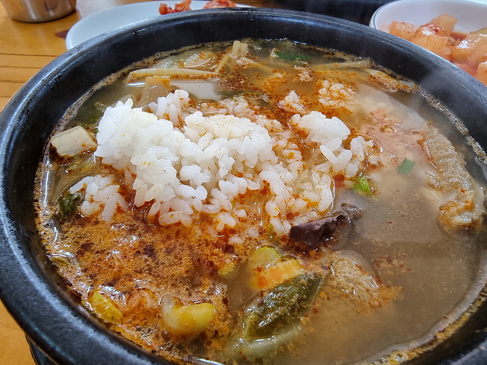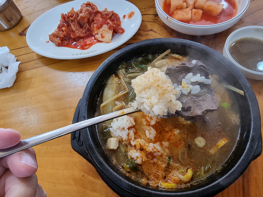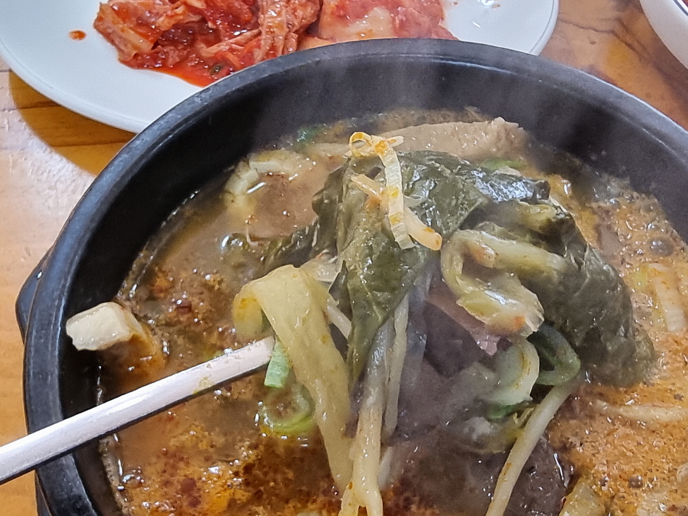 해장국도 국밥인지라 서둘러 밥을 말았다. 국물을 한껏 머금은 국밥에 깍뚜기나 김치를 올려 먹는 것은 국룰이라 하겠다. 국물이 진하고 뜨끈한 것이 해장국으로 제격이었다. 한국 사람들의 소울푸드는 역시 이런 뜨끈한 국물이 아닐까 한다. 조금은 헛헛하고 한기를 느꼈던 아침을 완전히 따끈하게 바꿔주는 진정한 마법의 음식이다. 이마에 흐르는 땀을 닦으며 정말 열심히 먹었다. 해장국은 이렇게 게걸스럽게 먹는 것이 또한 진정한 맛이다. 속도 든든하고 참 행복한 아침이었다.