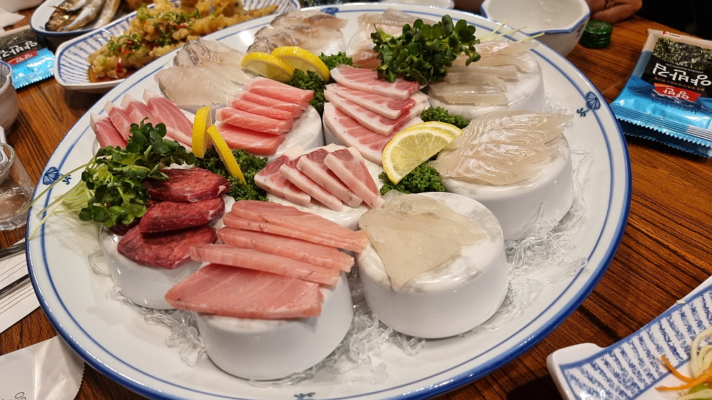 드디어 메인 메뉴인 회가 나왔다. 모듬회였는데 우럭이 아주 맛이 좋았다. 특이한 것은 아귀를 튀김으로 내어 준 것이다. 아귀튀김이라는 음식은 전에 먹어 본적이 없는 것 같은데 말이다. 시사모를 포함하여 생선구이도 괜찮았다. 전체적으로 회에만 집중한 구성은 분명 아니다. 만일 회를 양으로 때려 먹는 스타일인 사람이라면 조금 실망할 수도 있겠다. 그런 사람들은 이런 분위기의 횟집이 아니라 반찬이고 다른 구성이고 없이 그냥 회만 드립다 먹는 시장형 횟집이 어울릴 것이다. 아무튼 우리는 만족스러웠다. 회식에서 이렇게 많은 음식을 먹는 모습을 처음 보았다고 이야기 해주는 사람이 있을 만큼 젖가락을 재빨리 움직였다.