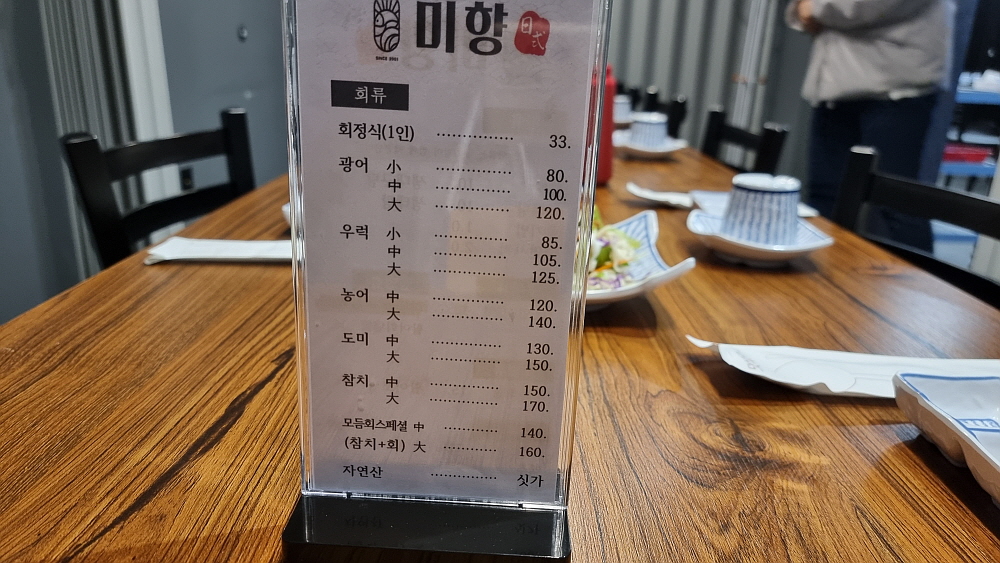 10명이나 되는 사람들이 한 자리에서 회식을 하려면 고려해야 할 부분이 많이 있다. 우선 이 인원이 들어가 앉을 수 있는 자리가 충분한가를 먼저 봐야하고, 가게 분위기가 회식과 어울리는가도 생각해 봐야 한다. 주차장이나 음식의 메뉴도 중요하다. 이런 것들이 모두 충족되면 다음은 가성비도 봐야 한다. 이날 우리는 이런 회식 분위기에 잘맞는 이집을 가게 되었다. 군내면 포천일고 입구에 있는 미향이라는 횟집이다. 몇 년 전 여기에서 코다리찜을 팔 때 한 번 온적이 있다. 지금과는 사뭇 다른 분위기와 메뉴 구성이었다. 같은 주인인지는 몰라도 가게 이름은 그대로지만 완전히 다른 집으로 바뀌었다.