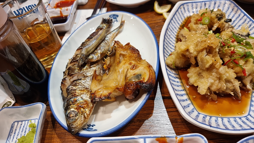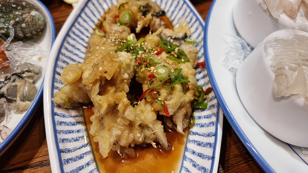드디어 메인 메뉴인 회가 나왔다. 모듬회였는데 우럭이 아주 맛이 좋았다. 특이한 것은 아귀를 튀김으로 내어 준 것이다. 아귀튀김이라는 음식은 전에 먹어 본적이 없는 것 같은데 말이다. 시사모를 포함하여 생선구이도 괜찮았다. 전체적으로 회에만 집중한 구성은 분명 아니다. 만일 회를 양으로 때려 먹는 스타일인 사람이라면 조금 실망할 수도 있겠다. 그런 사람들은 이런 분위기의 횟집이 아니라 반찬이고 다른 구성이고 없이 그냥 회만 드립다 먹는 시장형 횟집이 어울릴 것이다. 아무튼 우리는 만족스러웠다. 회식에서 이렇게 많은 음식을 먹는 모습을 처음 보았다고 이야기 해주는 사람이 있을 만큼 젖가락을 재빨리 움직였다.