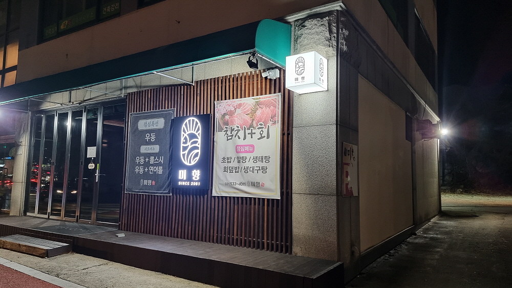 10명이나 되는 사람들이 한 자리에서 회식을 하려면 고려해야 할 부분이 많이 있다. 우선 이 인원이 들어가 앉을 수 있는 자리가 충분한가를 먼저 봐야하고, 가게 분위기가 회식과 어울리는가도 생각해 봐야 한다. 주차장이나 음식의 메뉴도 중요하다. 이런 것들이 모두 충족되면 다음은 가성비도 봐야 한다. 이날 우리는 이런 회식 분위기에 잘맞는 이집을 가게 되었다. 군내면 포천일고 입구에 있는 미향이라는 횟집이다. 몇 년 전 여기에서 코다리찜을 팔 때 한 번 온적이 있다. 지금과는 사뭇 다른 분위기와 메뉴 구성이었다. 같은 주인인지는 몰라도 가게 이름은 그대로지만 완전히 다른 집으로 바뀌었다.